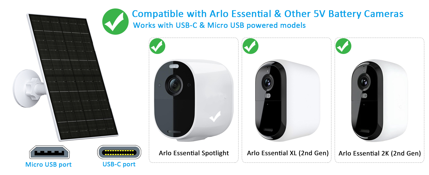 توافق واسع: اللوحة الشمسية 7 واط متوافقة مع كاميرات Arlo Essential 2K (الجيل الثاني)، وEssential XL، وEssential Spotlight. كما أنه متوافق مع معظم الكاميرات الأمنية التي تعمل بالبطارية القابلة لإعادة الشحن بقدرة 5 فولت، وذلك بفضل موصل USB-C إلى Micro-USB المتضمن. غير متوافق مع موديلات Arlo Doorbell أو السلكية أو المكونات الإضافية.