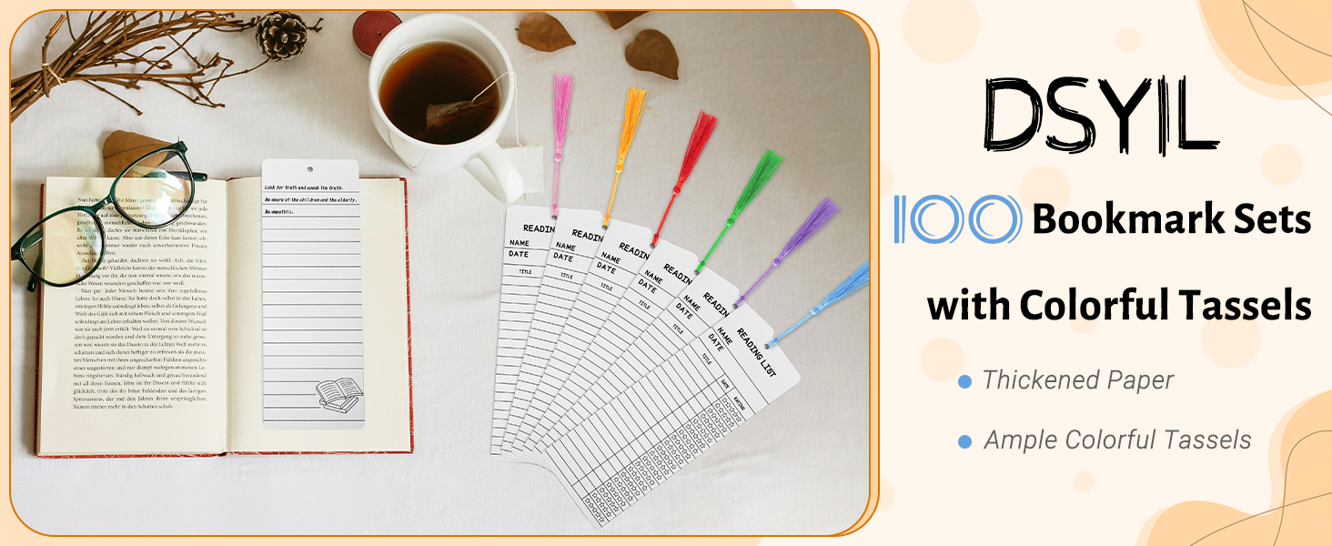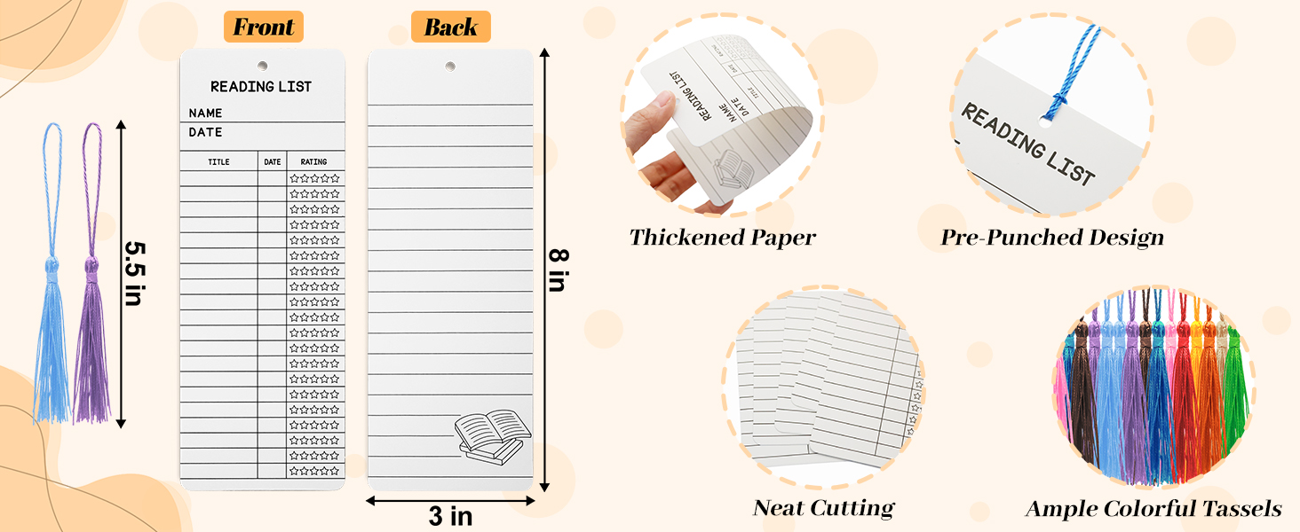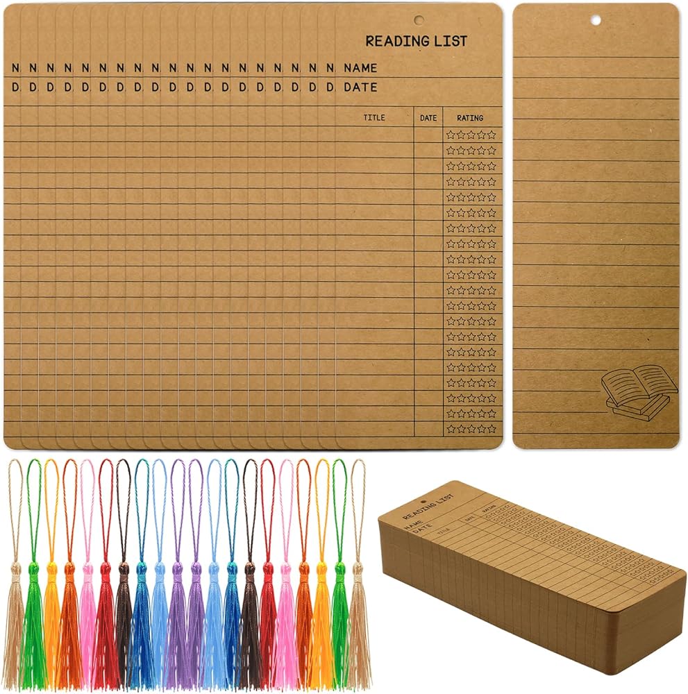 مجموعة تعقب القراءة بالجملة: تتضمن 100 مجموعة من الإشارات المرجعية لبطاقات المكتبة و100 شرابة ملونة؛ مثالي لتتبع قائمة القراءة الشهرية أو تنظيم نادي كتب كبير