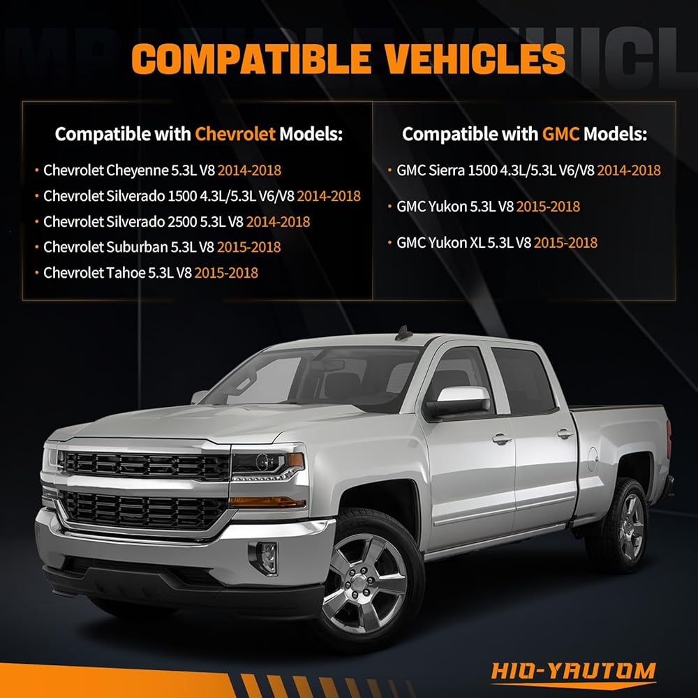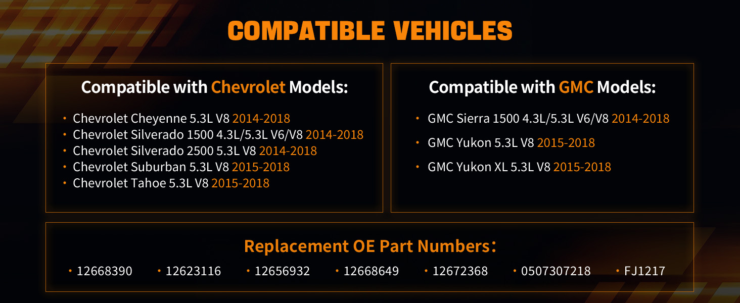 • المركبات المتوافقة: متوافقة مع شيفروليه سيلفرادو 1500 4.3L V6 5.3L V8 2014-2018، سيلفرادو 2500 V8 5.3L 2014-2018، سوبربان 5.3L V8 2015-2018، تاهو 5.3L V8 2015-2018، شايان 5.3L V8 2014-2018؛ متوافق مع جي إم سي سييرا 1500 4.3L V6 5.3L V8 2014-2018، يوكون 5.3L V8 2015-2018، يوكون XL 5.3L V8 2015-2018