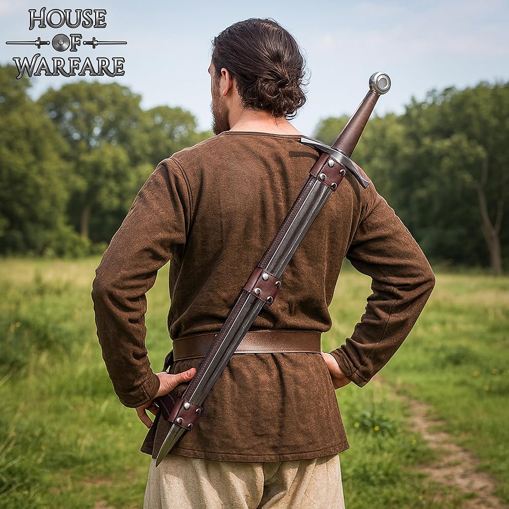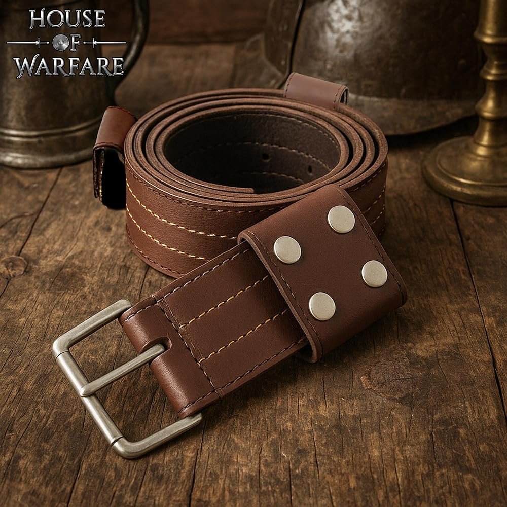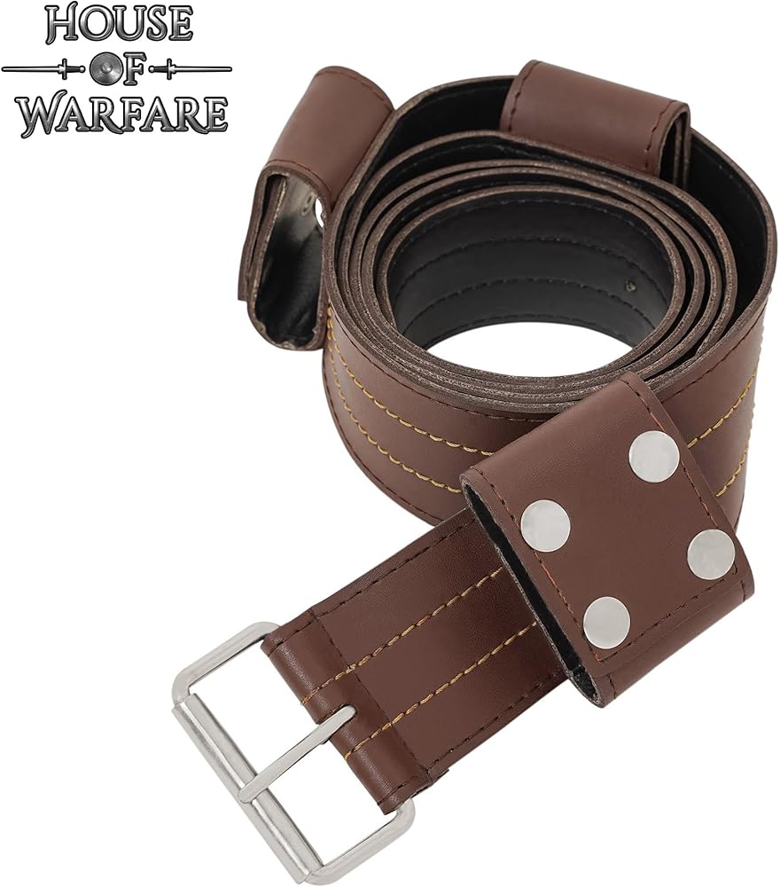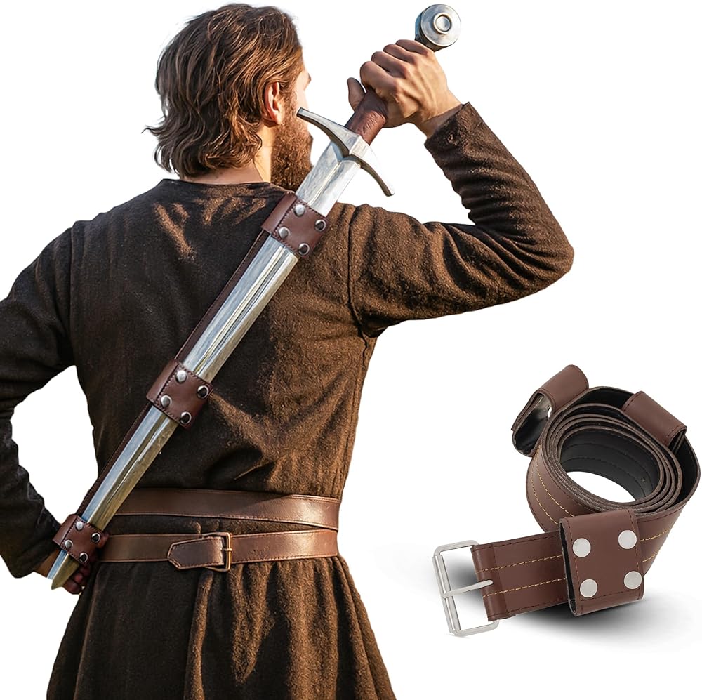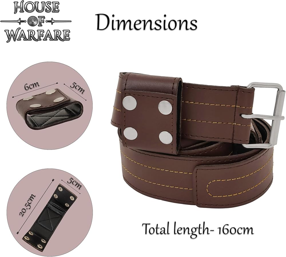 Durable Faux Leather Construction: Made from tough 3 mm faux leather with reinforced stitching for strength and look. 63-Inch Design: Provides an adjustable, comfortable cross-body fit for most body sizes, ideal for carrying swords or daggers. Secure Sword Loops: Has 3 sturdy loops with 4 metal buttons each for easy opening and closing so that your sword holds firmly in place. Fixed Loop Attachment: Loops are securely stitched for durability and authentic medieval use, not removable for extra strength. Nickel-Coated Iron Buckle: Solid iron buckle with a nickel finish resists rust and ensures a strong, reliable hold. Perfect for Reenactment & LARP: Great for medieval reenactments, cosplay, Renaissance fairs, or as a decorative display piece.