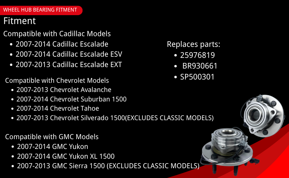 【مناسبة】محامل العجلات ومجموعة المحور تناسب 2008-2013 Chevy Silverado 1500، لـ 2007-2013 GMC Sierra 1500، لـ 2007-2013 Chevy Tahoe، لـ 2007 Chevy Silverado 1500، لـ 2007-2014 Chevy Suburban 1500، لـ 2007-2014 جي إم سي يوكون ، لـ 2007-2013 جي إم سي يوكون XL 1500 ، لـ 2007-2013 تشيفي أفالانش ، لـ 2007-2014 كاديلاك إسكاليد ، لـ 2008-2014 كاديلاك إسكاليد ESV ، لـ 2014 تشيفي تاهو ، ل 2007-2013 كاديلاك إسكاليد EXT، لعام 2007 كاديلاك إسكاليد ESV، لعام 2014 جي إم سي يوكون XL 1500 (قاعدة، فاخرة، بلاتينيوم، بريميوم، LS، LT، LTZ، PPV، SSV، دينالي، SLE، SLT، Hybrid Platinum، Hybrid، Black Diamond LS، Black Diamond LT، Black Diamond LTZ، WT، SL، دينالي هايبرد، إصدار خاص، لوجو)