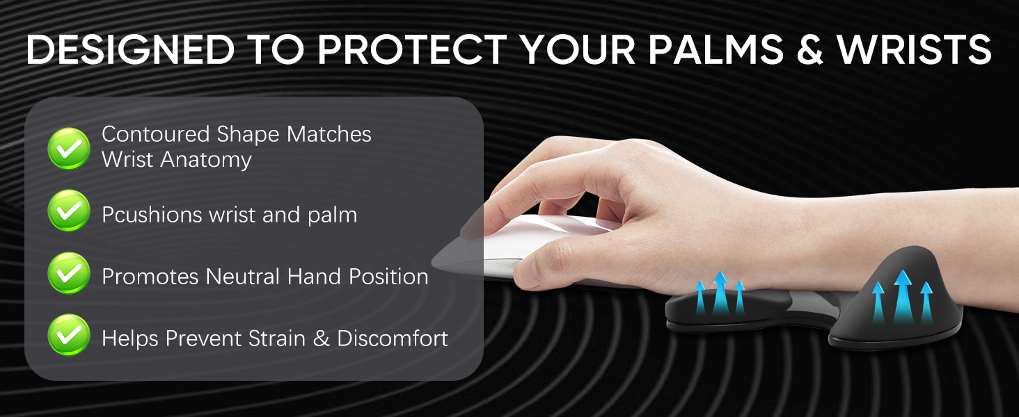 ✔【تصميم دعم مزدوج】يضع مسند اليد يدك ومعصمك في وضع مريح، ويدعم كلا من راحة اليد والمعصم لتوفير الراحة الكاملة! يضمن هذا التصميم المبتكر أن تكون يدك بالكامل محتضنة، مما يقلل من نقاط الضغط ويعزز المحاذاة الطبيعية أثناء الاستخدام الممتد.