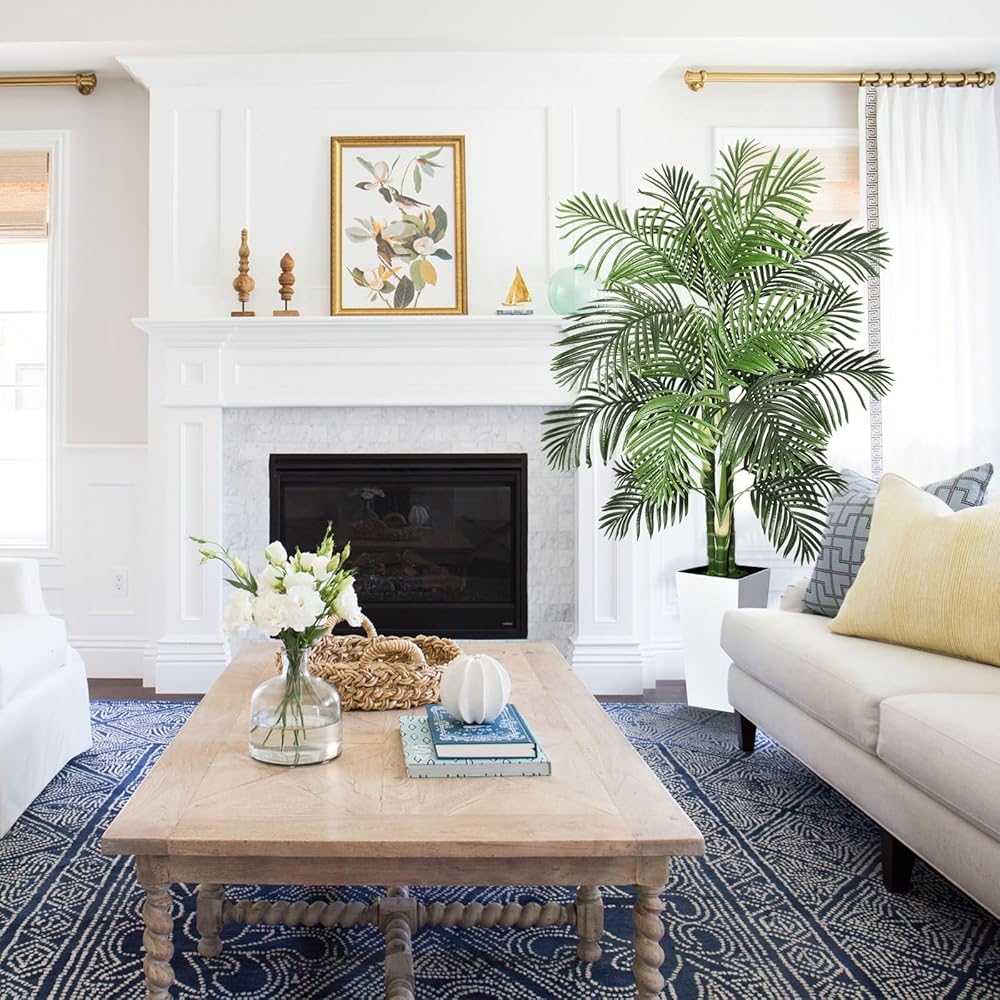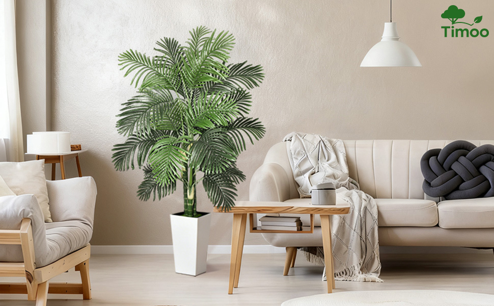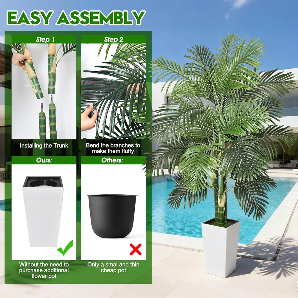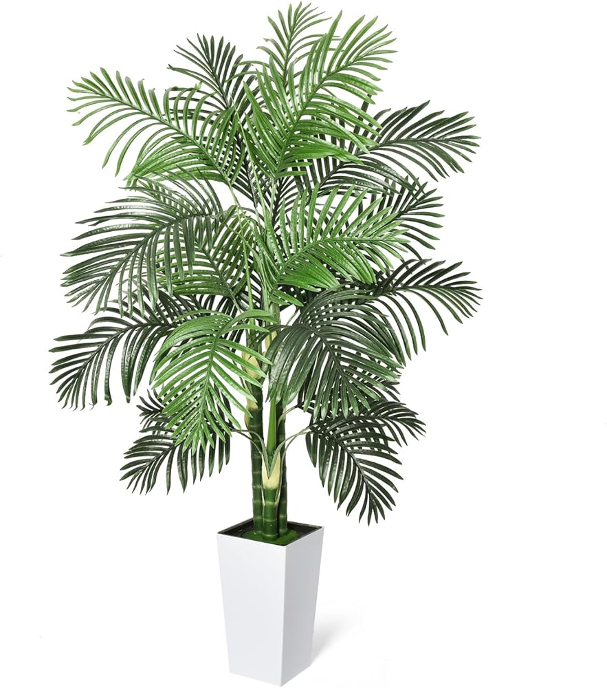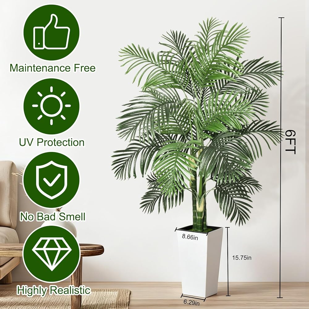 Timoo وهمية شجرة النخيل الديكور 6 قدم النباتات الاصطناعية في الأماكن المغلقة مع زارع طويل القامة الأبيض، مقاومة للأشعة فوق البنفسجية شجرة النخيل وهمية الأريكا مع 3 جذوع نابضة بالحياة وأوراق كاملة، نبات وهمية للمنزل مكتب داخلي في الهواء الطلق