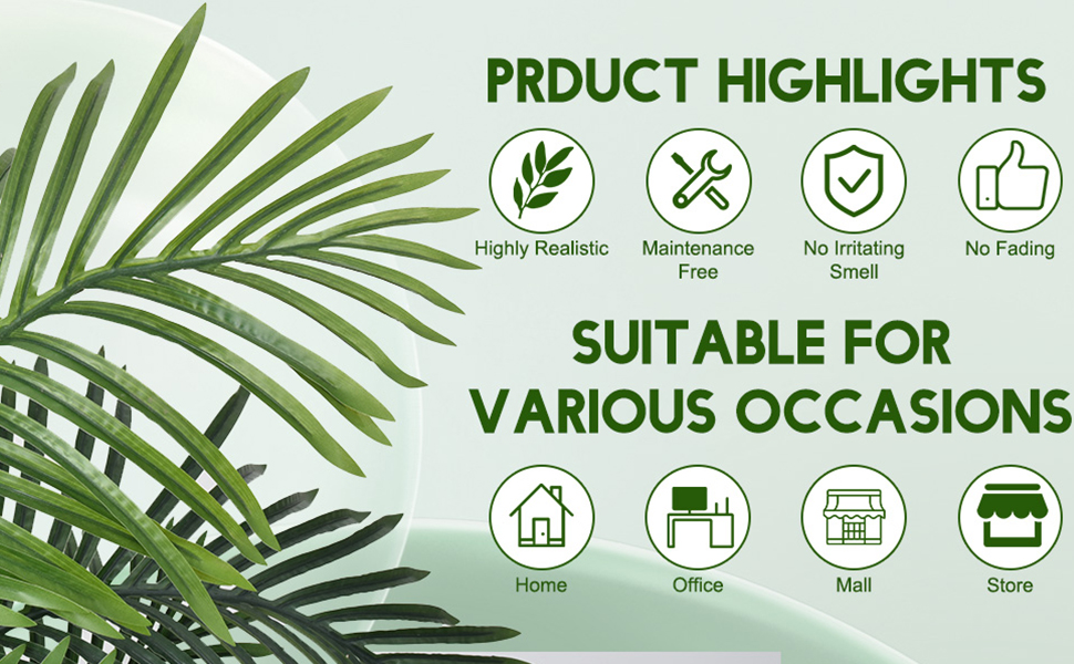 مناسبة لأي مكان: تتمتع شجرة النخيل بمقاومة ممتازة للأشعة فوق البنفسجية. سواء تم وضعه في غرفة المعيشة أو غرفة النوم أو المكتب في الداخل أو عند المدخل أو الفناء أو الشرفة في الهواء الطلق، فإنه يمكنه الحفاظ على لونه الزاهي لفترة طويلة ولن يبهت بسبب ضوء الشمس.