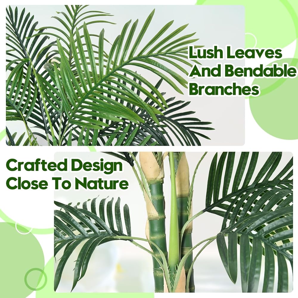 تصميم واقعي: تحتوي شجرة النخيل على 20 ورقة كبيرة، معبأة بكثافة بسعف أصغر، كل منها ذات ملمس طبيعي وملمس أصلي. 3 جذوع مرتبة بنمط متدرج يحاكي نمط نمو شجرة النخيل الحقيقية، طبيعية وفريدة من نوعها
