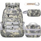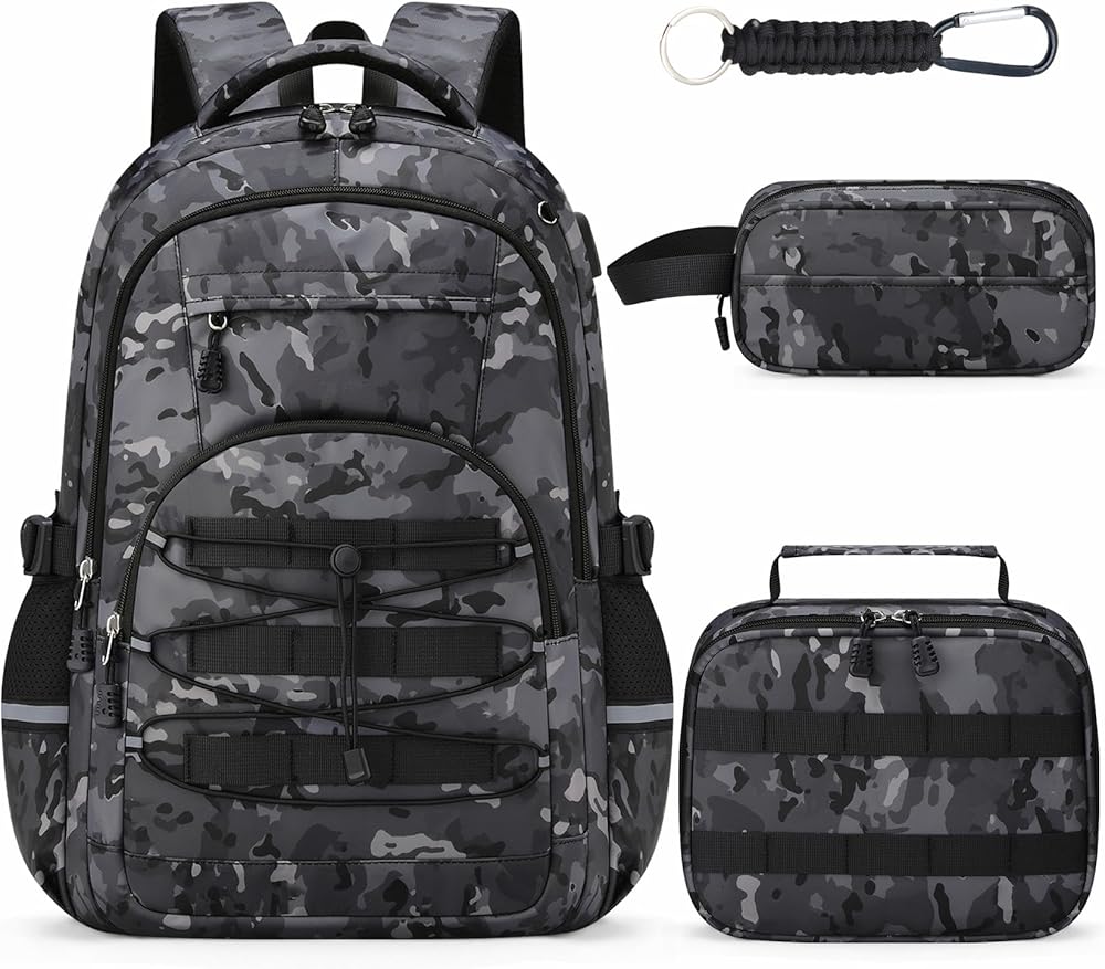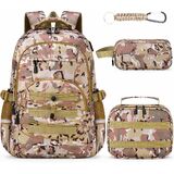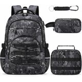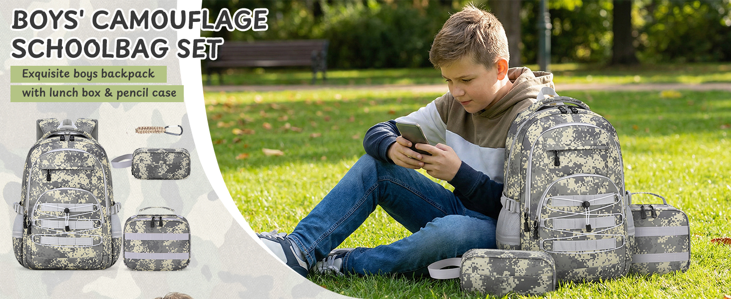 【مجموعة حقيبة ظهر للأولاد 4 في 1】تتميز مجموعة حقيبة الظهر للأطفال 4 في 1 للأولاد بحقيبة ظهر مموهة للأولاد، وحقيبة غداء مطابقة، وحقيبة أقلام وسلسلة مفاتيح - كل ما يحتاجه المراهقون لمغامراتهم اليومية! مع مساحة تخزين كبيرة في كل من حقيبة الظهر وحقيبة الغداء، أصبح تنظيم الكتب واللوازم والوجبات الخفيفة أمرًا بسيطًا للغاية. مثالية للطلاب من المرحلة الابتدائية حتى المدرسة الثانوية!