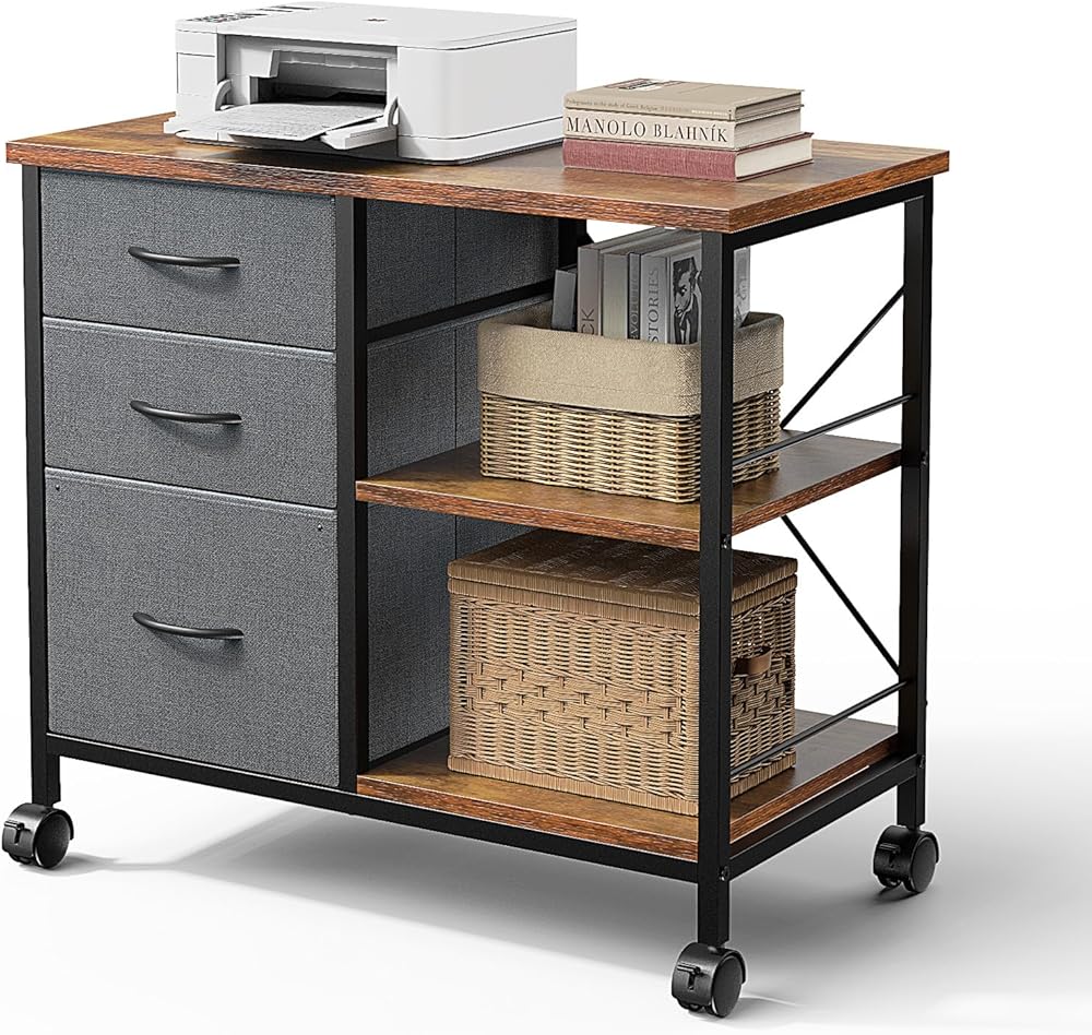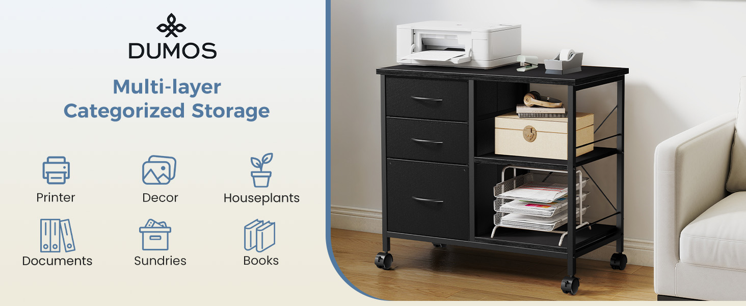 حامل طابعة عالي التحمل ودعم خلفي: تتميز هذه الخزانة المتنقلة بشريط دعم خلفي معزز، وهي عبارة عن طاولة طباعة قوية مع مساحة تخزين. يحمل الجزء العلوي 110 رطلاً للطابعات أو الشاشات، بينما يوفر الرف (22 رطلاً) والأدراج (الكبيرة 22 رطلاً والصغيرة 11 رطلاً) مساحة تخزين مكتبية متعددة الاستخدامات.