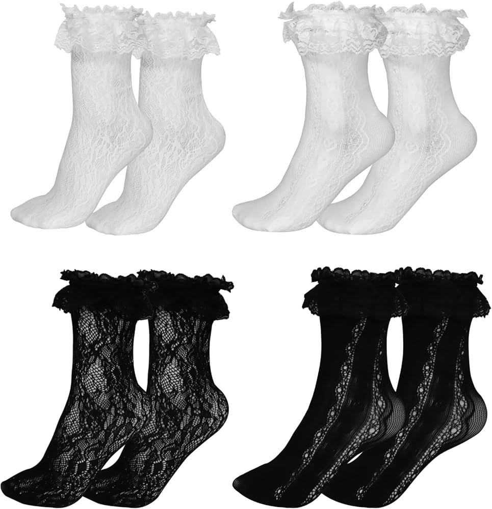 4 أزواج من الجوارب النسائية الدانتيل للكاحل، جوارب شبكية مثيرة من الدانتيل، جوارب لوليتا للنساء من الدانتيل المكشكش لجميع أنواع الحفلات وحفلات الشاي تتماشى مع جميع أنواع الأحذية