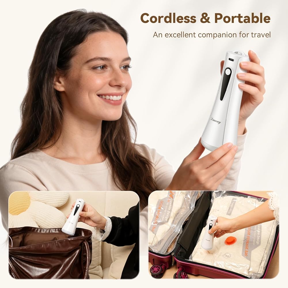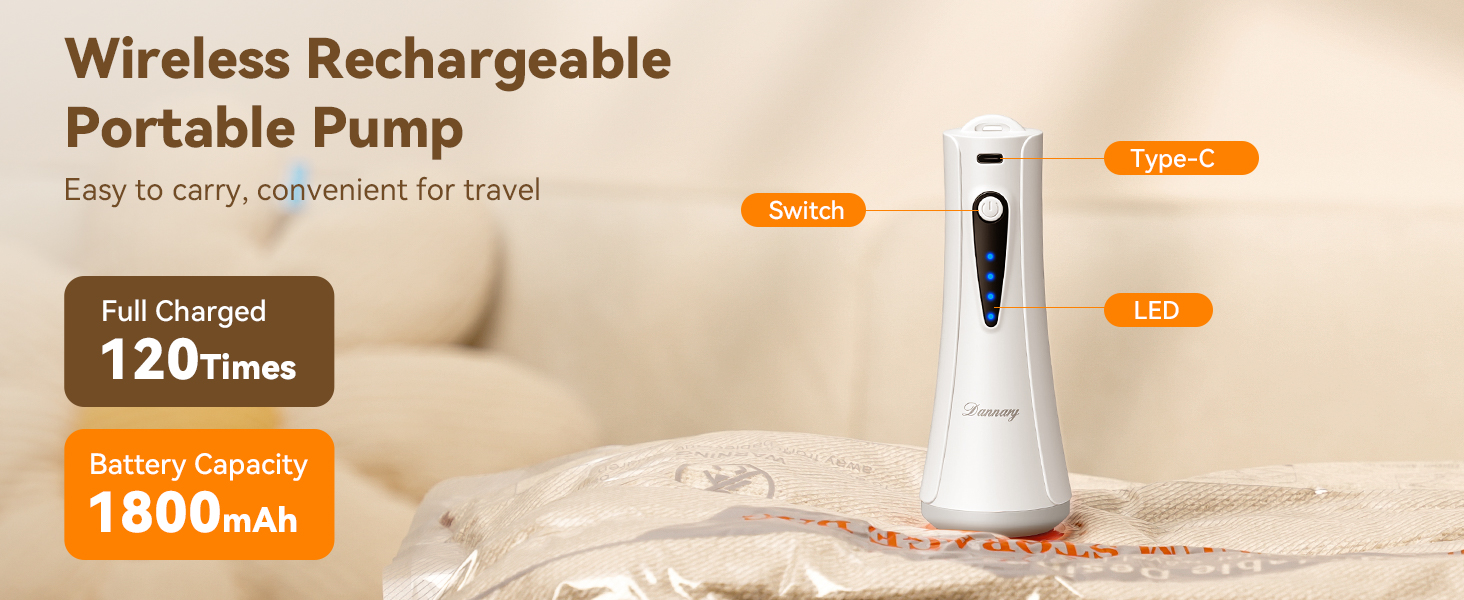 【مضخة هواء لاسلكية قوية قابلة لإعادة الشحن】: بطارية قابلة لإعادة الشحن بقدرة 1800 مللي أمبير في الساعة تضغط ما يصل إلى 120 كيسًا لكل شحنة. شحن USB (كمبيوتر محمول/بنك طاقة) للاستخدام العالمي، مثالي للسفر.
