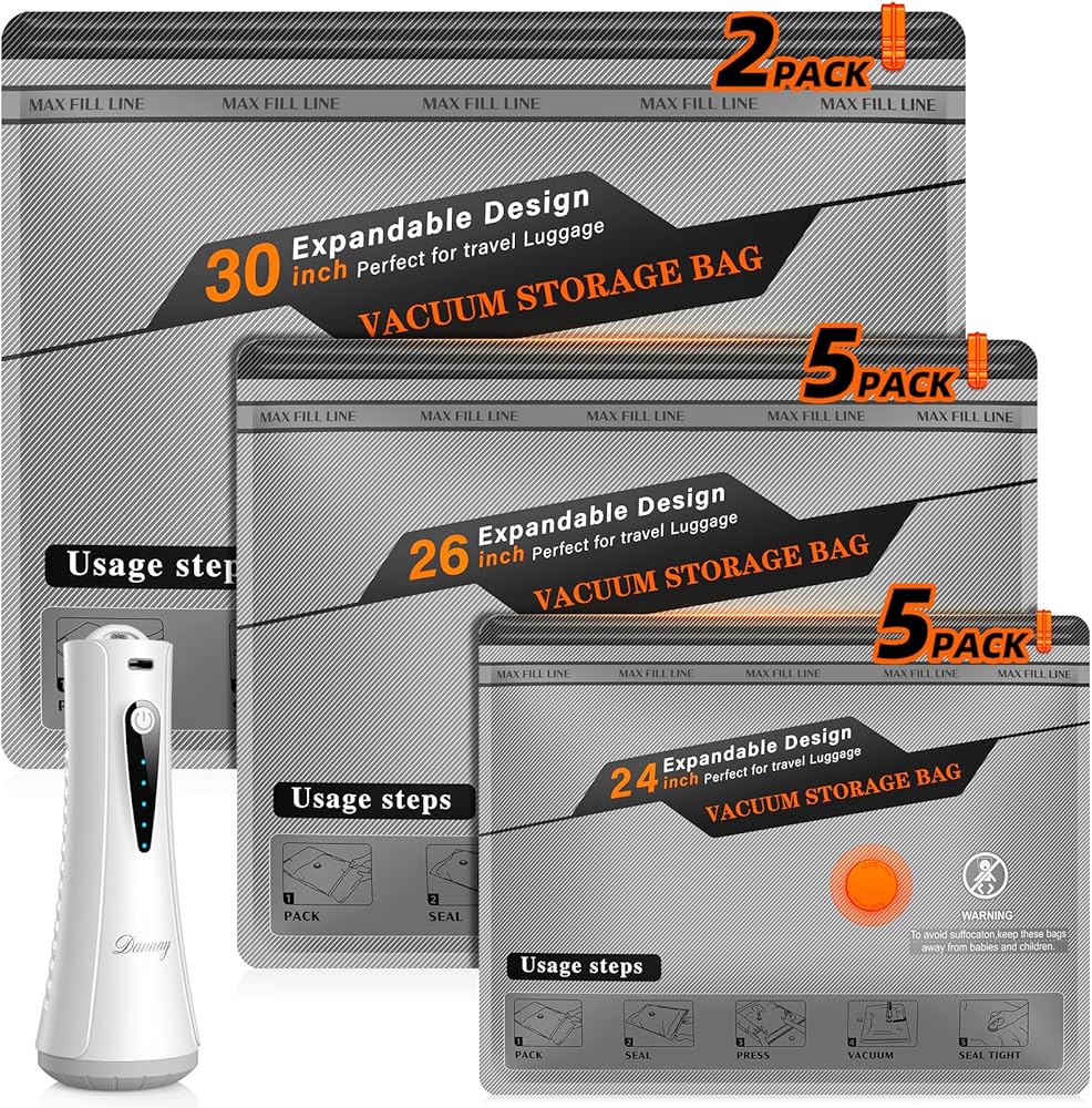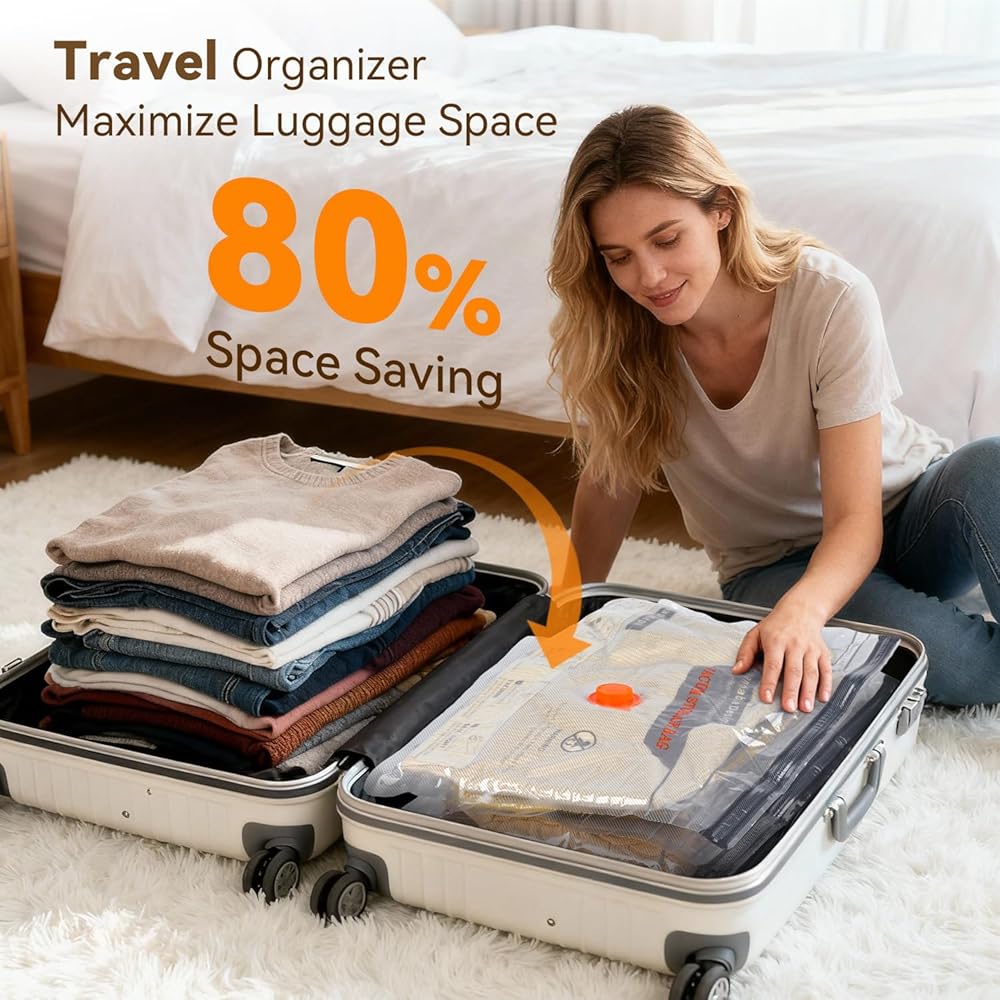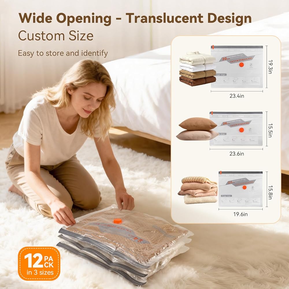 【حقائب تخزين مخصصة بحجم السفر】: تتضمن 12 كيسًا (3 مقاسات: 23.6 بوصة × 19.7 بوصة، 23.6 بوصة × 15.8 بوصة، 19.7 بوصة × 15.8 بوصة). مثالية لتخزين الملابس والفراش وأدوات السفر، مما يقلل الحجم بنسبة تصل إلى 80%.