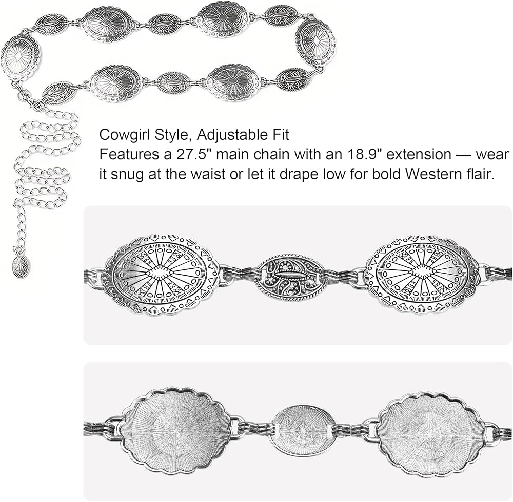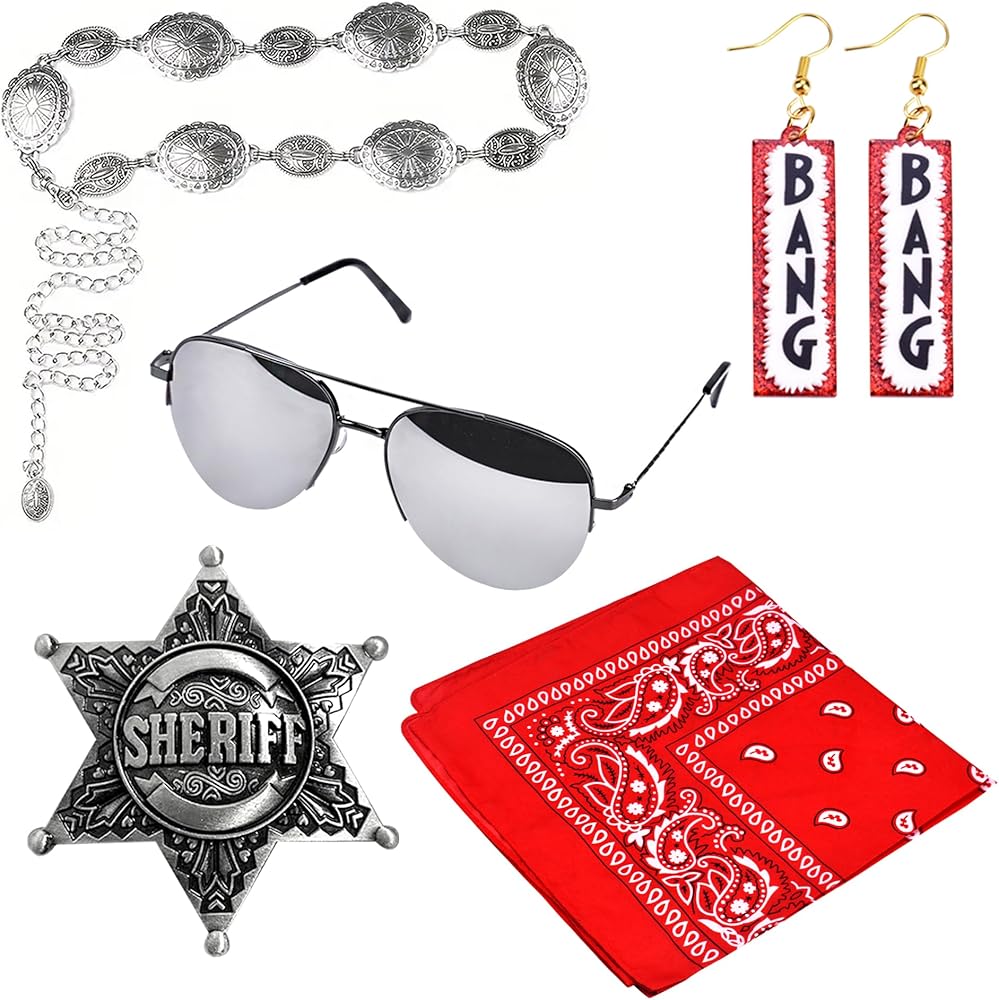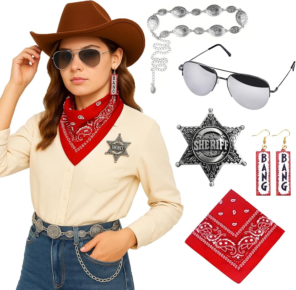 It includes a concho-style metal chain belt that adds just the right amount of Western edge, a classic red bandana, a silver-tone sheriff badge, cool aviator sunglasses, and playful BANG earrings. These pieces are lightweight, comfortable, and easy to mix with jeans, dresses, or boots for an outfit that's ready to ride.