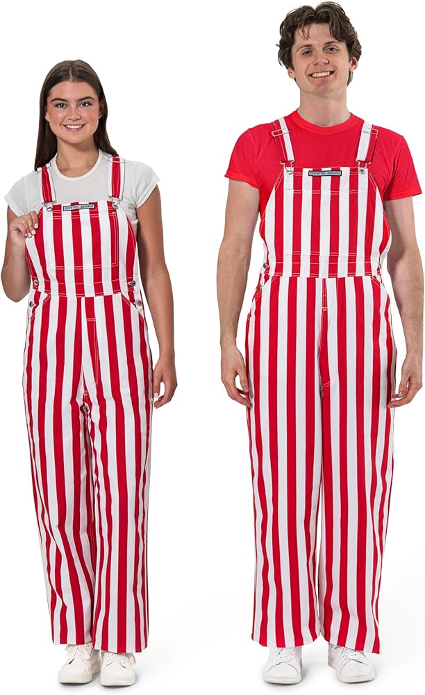 Cheer your favorite team in attention-grabbing style with these striped red and white game day outfits! Whether you're on rickety bleachers on a Friday night or trying to get on television at the Sunday morning tailgate, these women's and men's striped overalls will make you stand out in the crowd and leave an impression.