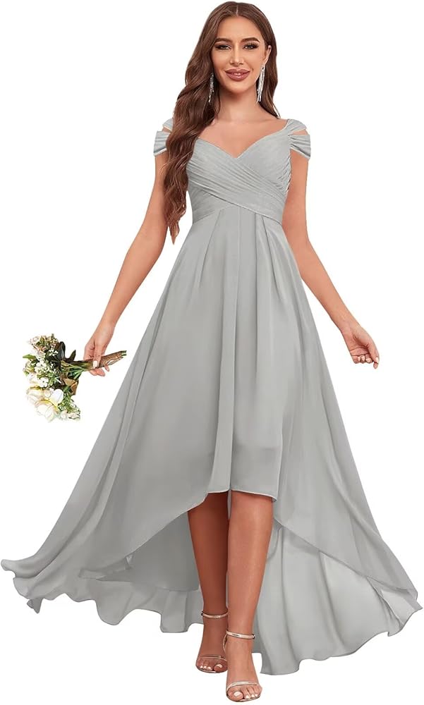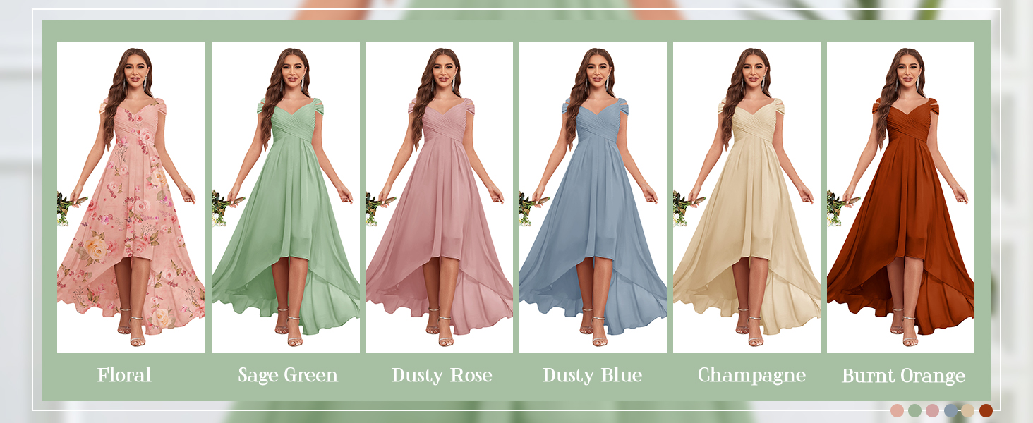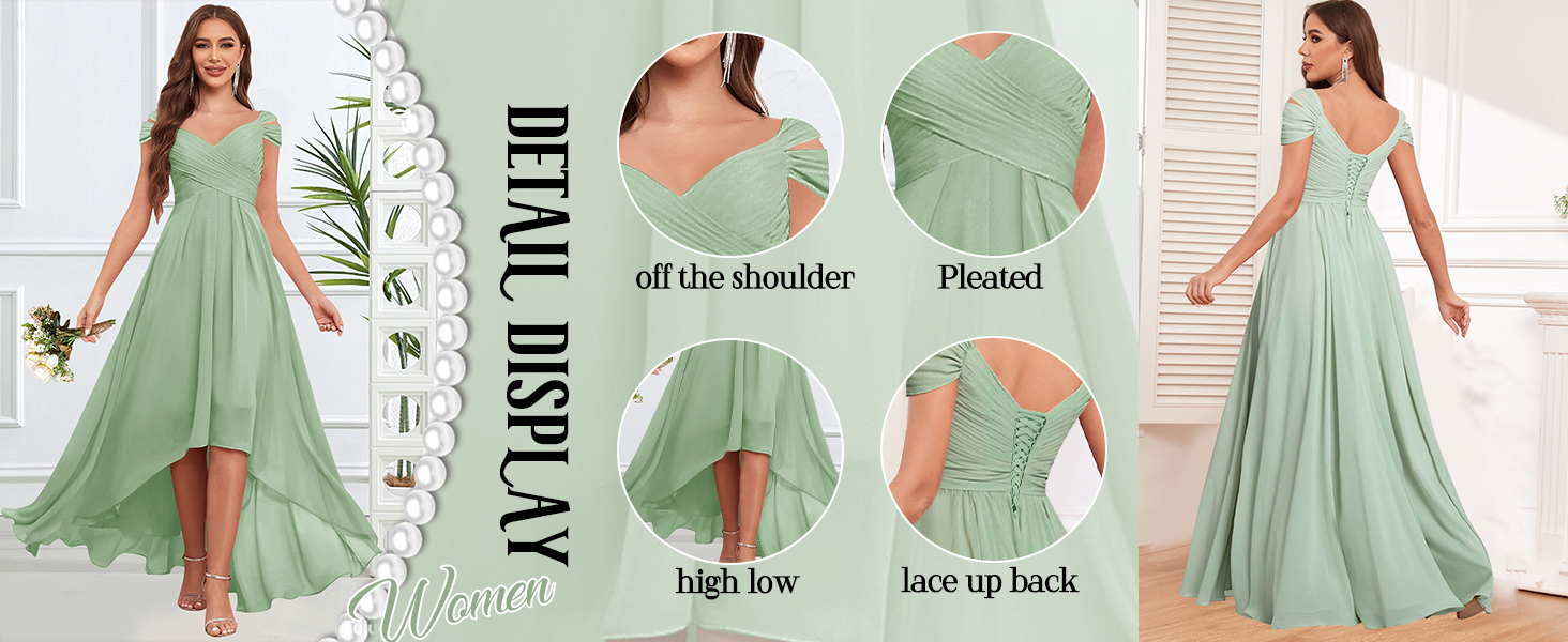 التصميم: فستان وصيفة العروس من الشيفون بدون الكتف، فساتين وصيفة العروس مطوية، فساتين وصيفة العروس عالية ومنخفضة لحفلات الزفاف، فستان رسمي على شكل حرف A للنساء، طول الشاي، مبطن بالكامل، حمالة صدر مدمجة.