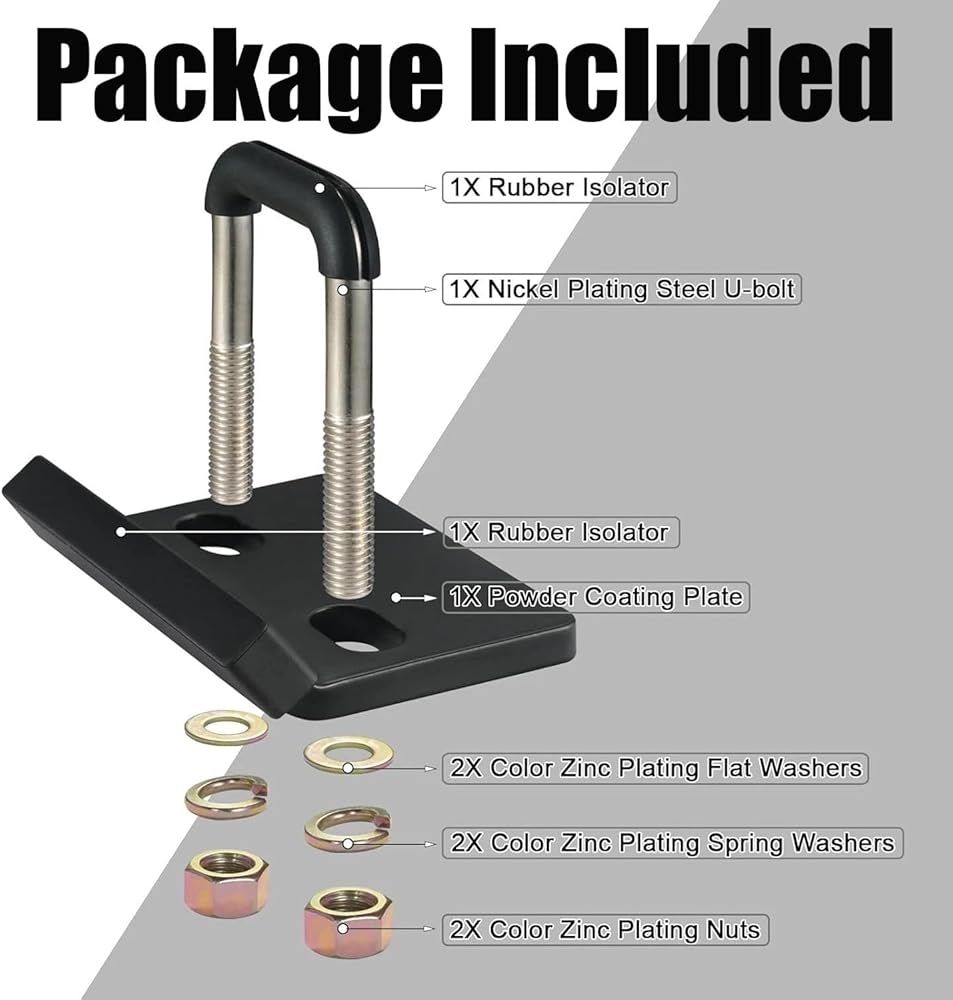 COMPLETE HARDWARE KIT: Includes all necessary components - rubber isolators, steel U-bolt, powder coating plate, zinc-plated washers, and nuts for easy installation
