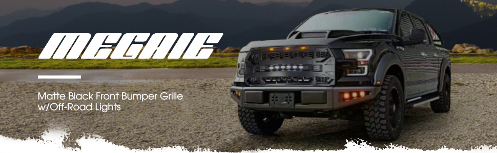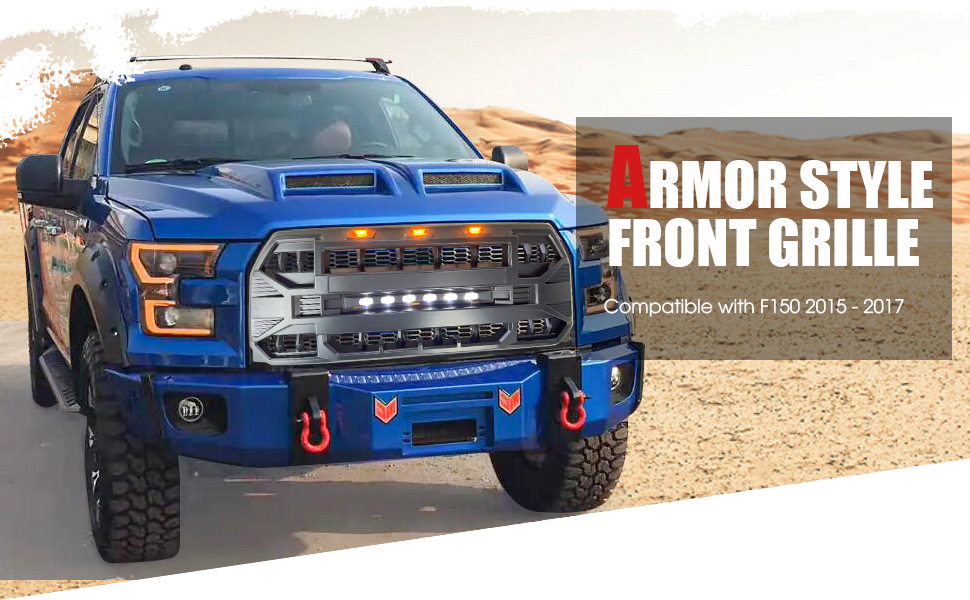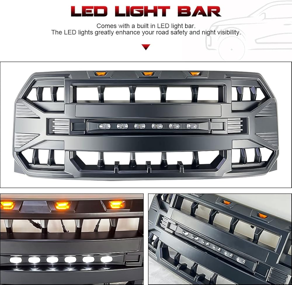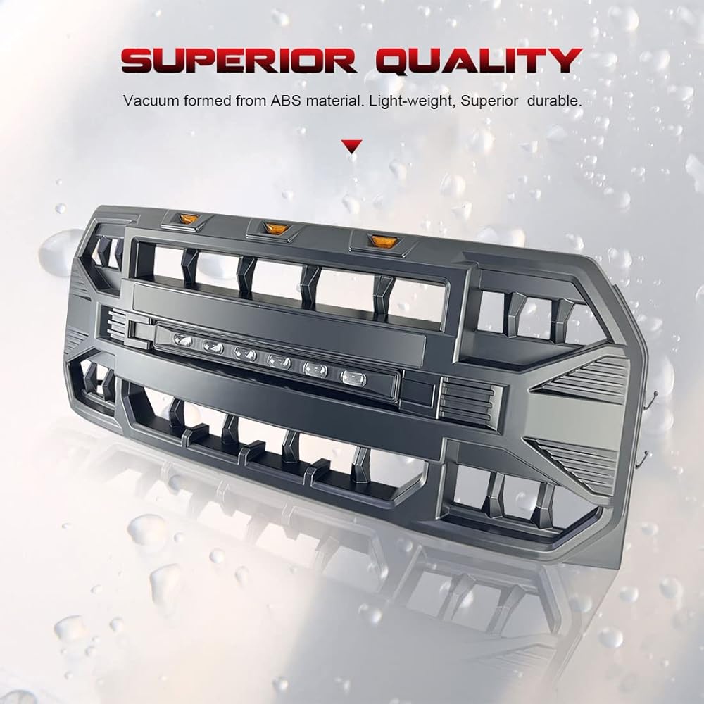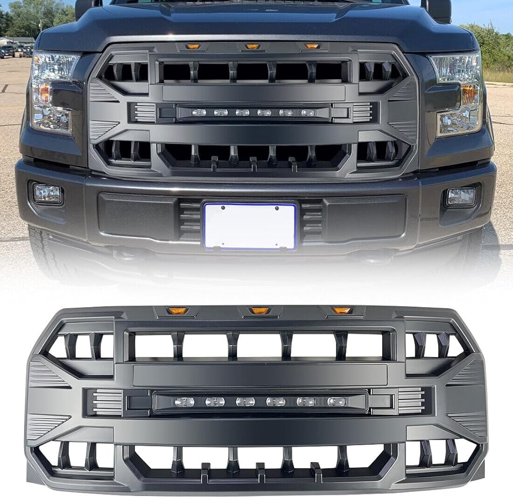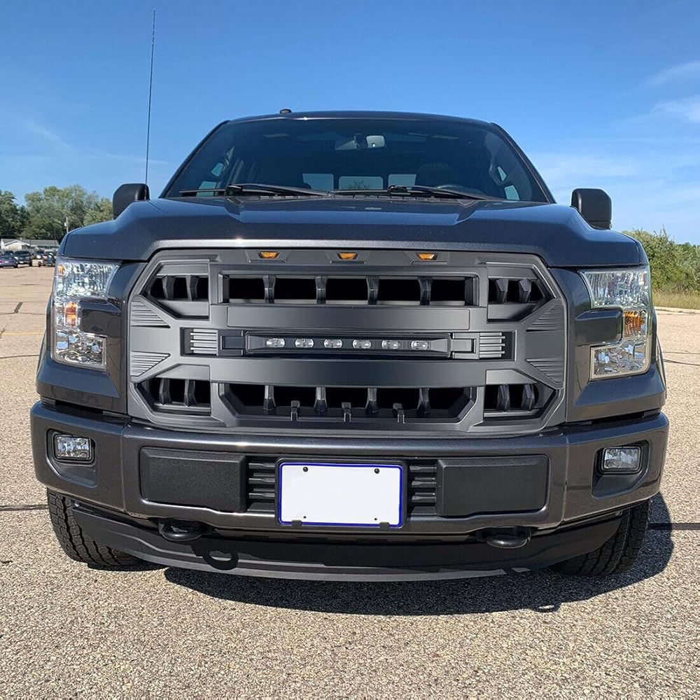 استبدال الشواية الأمامية لـ F150 2015 2016 2017، شبكة المصد الأمامي باللون الأسود غير اللامع مع أضواء الطرق الوعرة
