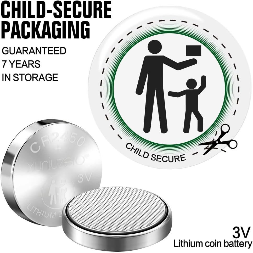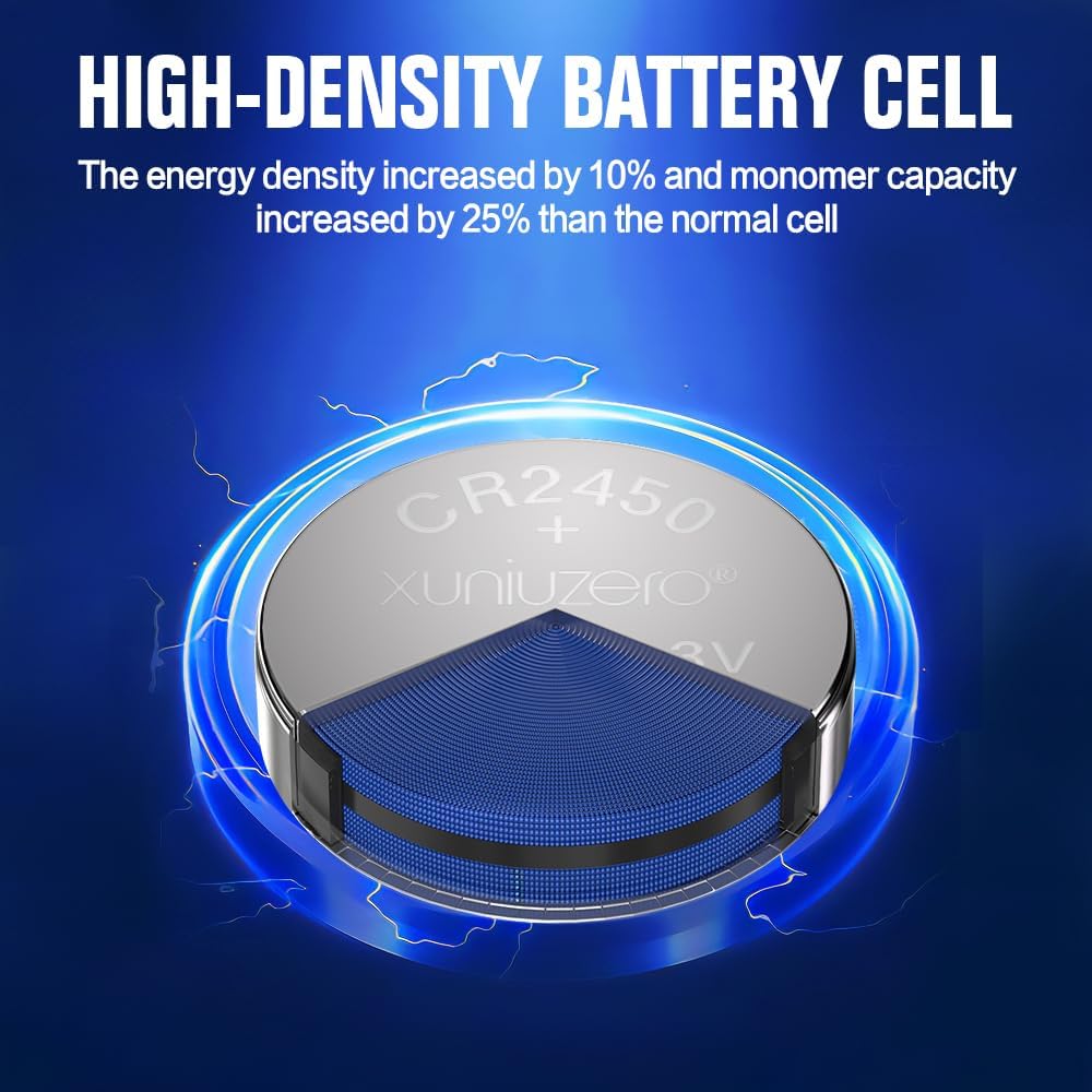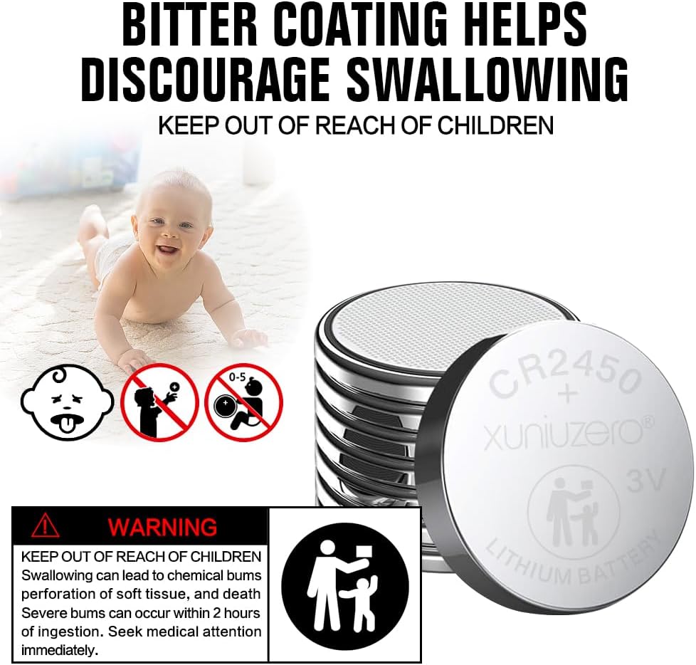 طاقة تدوم طويلاً - توفر بطارياتنا عالية الكثافة كثافة طاقة أعلى بنسبة 10% وقدرة أكبر بنسبة 20% من البطاريات العادية، مما يضمن أداءً فائقًا. تتميز بطاريات xuniuzero Lithium Coin CR2450 3V بطبقة مريرة غير سامة مطبقة على كلا الجانبين، للمساعدة في تثبيط البلع.