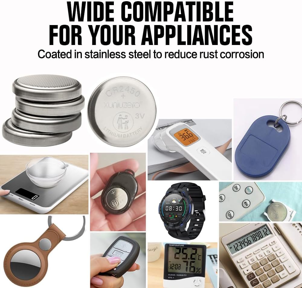 ساعات الطاقة وأجهزة الكمبيوتر والمزيد - كل بطارية xuniuzero 3 فولت CR2450 لها استخدامات غير محدودة تقريبًا: الساعات، واللوحات الأم للكمبيوتر، والآلات الحاسبة، ومسجلات الصوت الرقمية، وفتحات أبواب الجراج، وأطواق الحيوانات الأليفة، وساعات التوقف - جميعها تأخذ خلية بطارية تعمل بقطع النقود المعدنية.