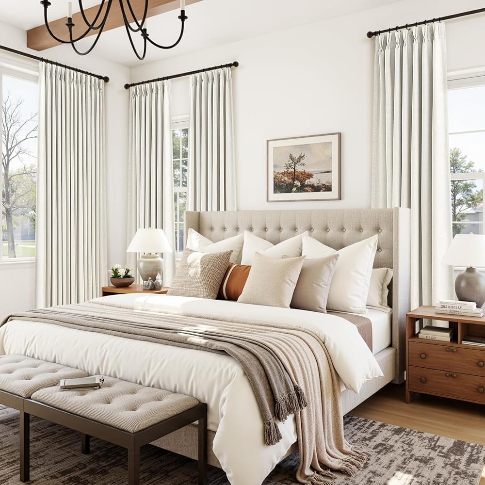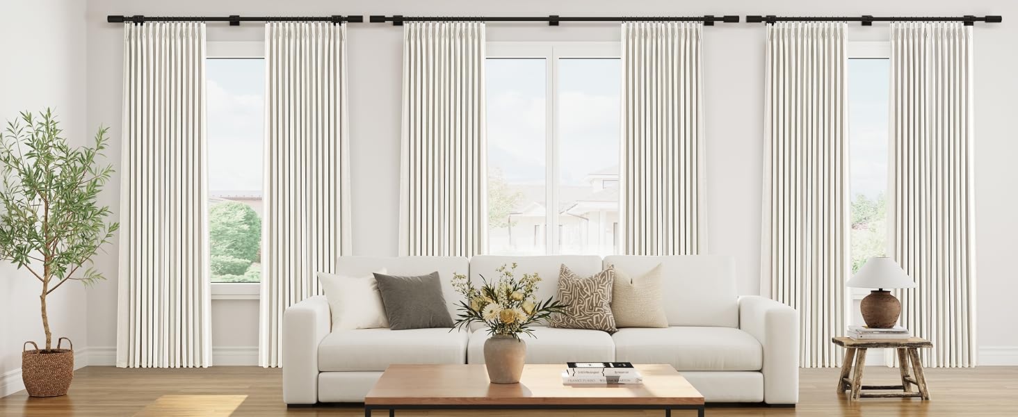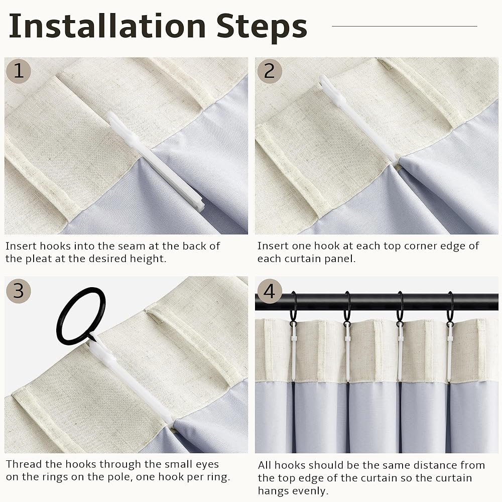 ملحقات مجانية وتعليق مرن: تشتمل كل مجموعة ستائر على مجموعة كاملة مكونة من 16 خطافًا و16 مشبكًا و16 حلقة. تم تصميم هذه الملحقات لتتناسب تمامًا مع الستارة، مما يمنع مشكلات التوافق. يمكنك أيضًا الاختيار من بين أربع طرق للتعليق: طيات الخطاف، أو المشبك الدائري، أو تركيب المسار، أو جيب القضيب المخفي. تسمح هذه المرونة بالإعداد السهل ليناسب أي تصميم للغرفة وتفضيل شخصي.