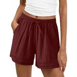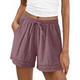 شورت كتان للنساء عالي الخصر برباط من الدانتيل، شورت صيفي للعطلات على الشاطئ، ملابس سفر in Kuwait