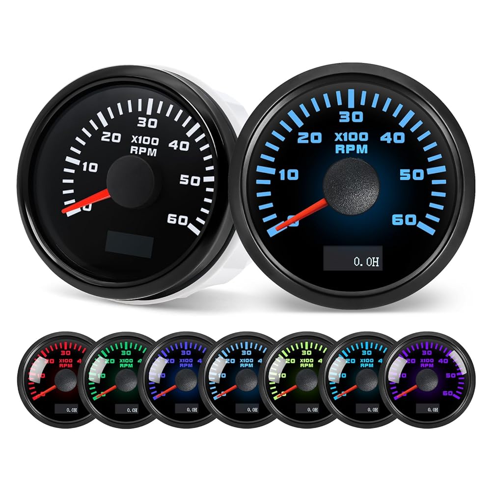 مقياس سرعة الدوران MH 2-1/6 بوصة 52 مم 6000 Tach Boat RPM مقياس 7 ألوان مقاوم للماء للسيارات والشاحنات البحرية (أسود)