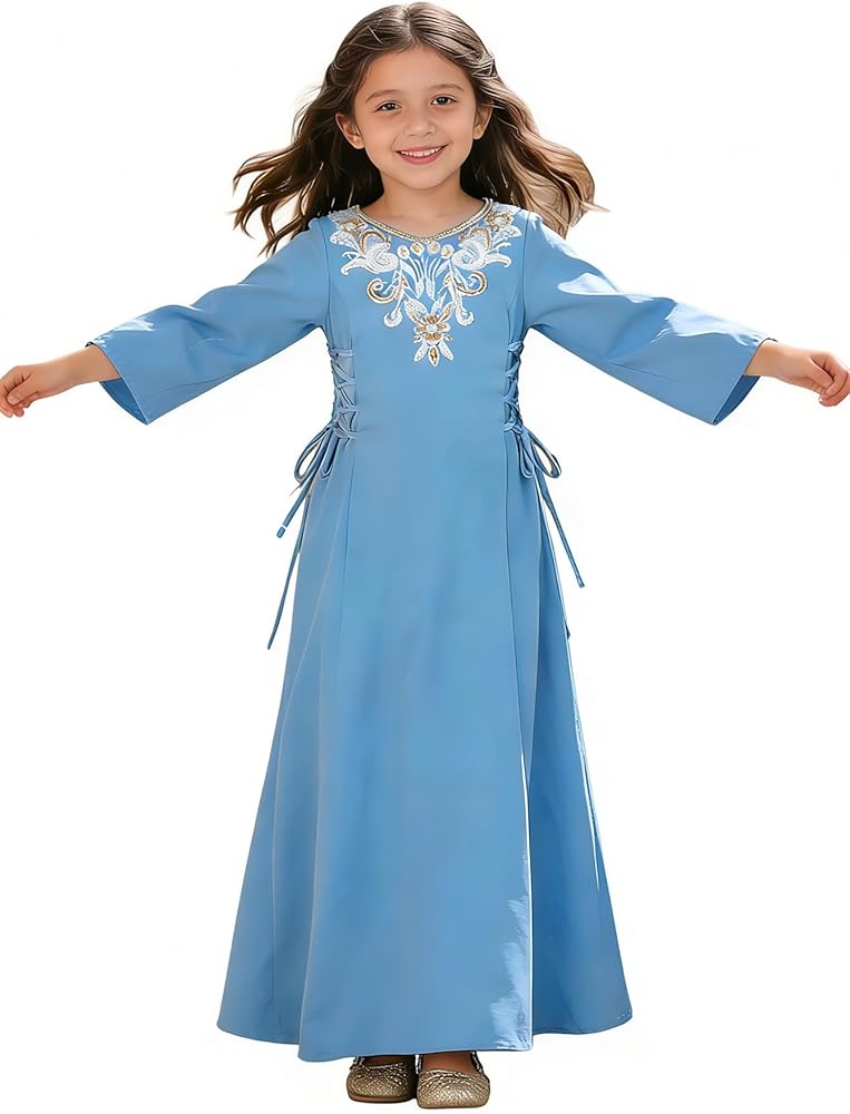 Adjustable Modest Fit: Features delicate lace-up side ties that let you customize the silhouette for a snug, comfortable fit as your child grows. The full-length maxi skirt and flare sleeves provide full coverage, aligning with Islamic modest dress principles while keeping her stylish and free to move.