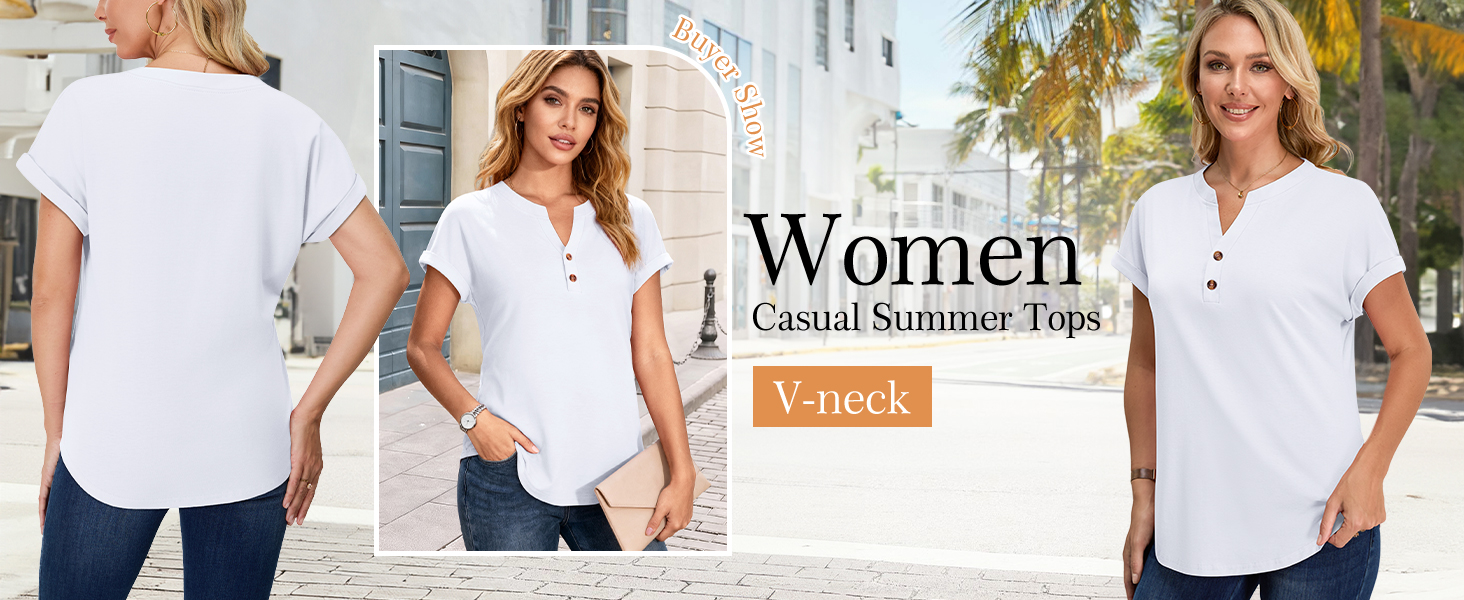 • النمط: قمصان قصيرة الأكمام للنساء تمزج بين الطراز العملي وغير الرسمي، وتجمع بين المقاس الفضفاض والتصميمات الخاصة برقبة على شكل حرف V وأكمام فضفاضة لطيفة، تنتقل بسهولة من النمط الرسمي إلى الأناقة اليومية، خيارات مثالية لخزانة ملابسك على مدار العام