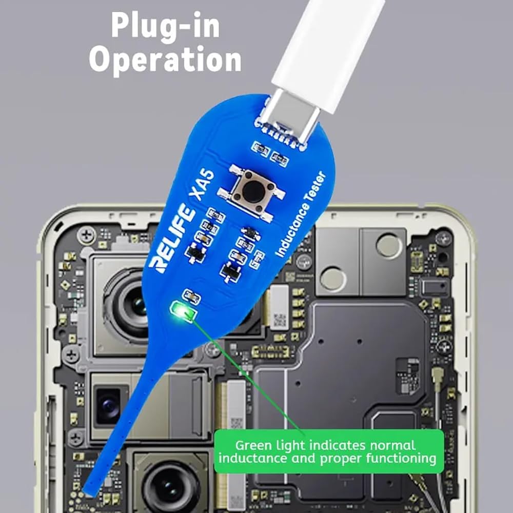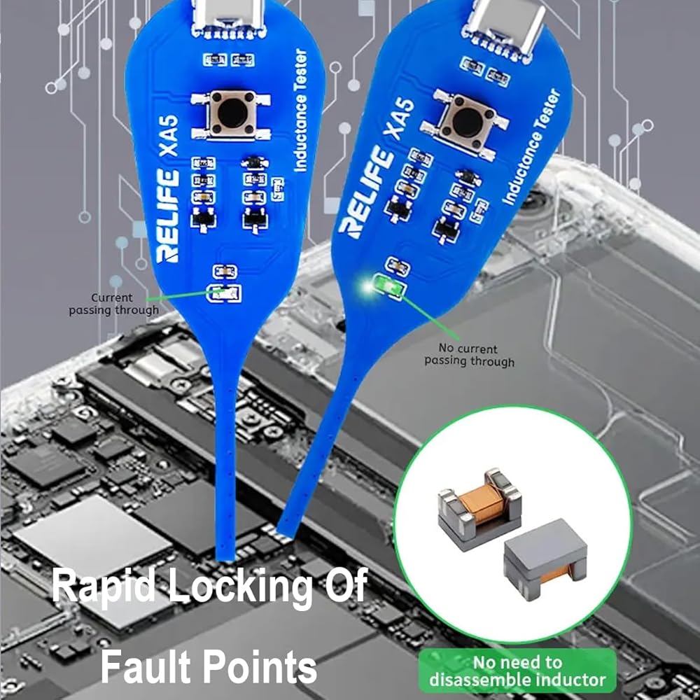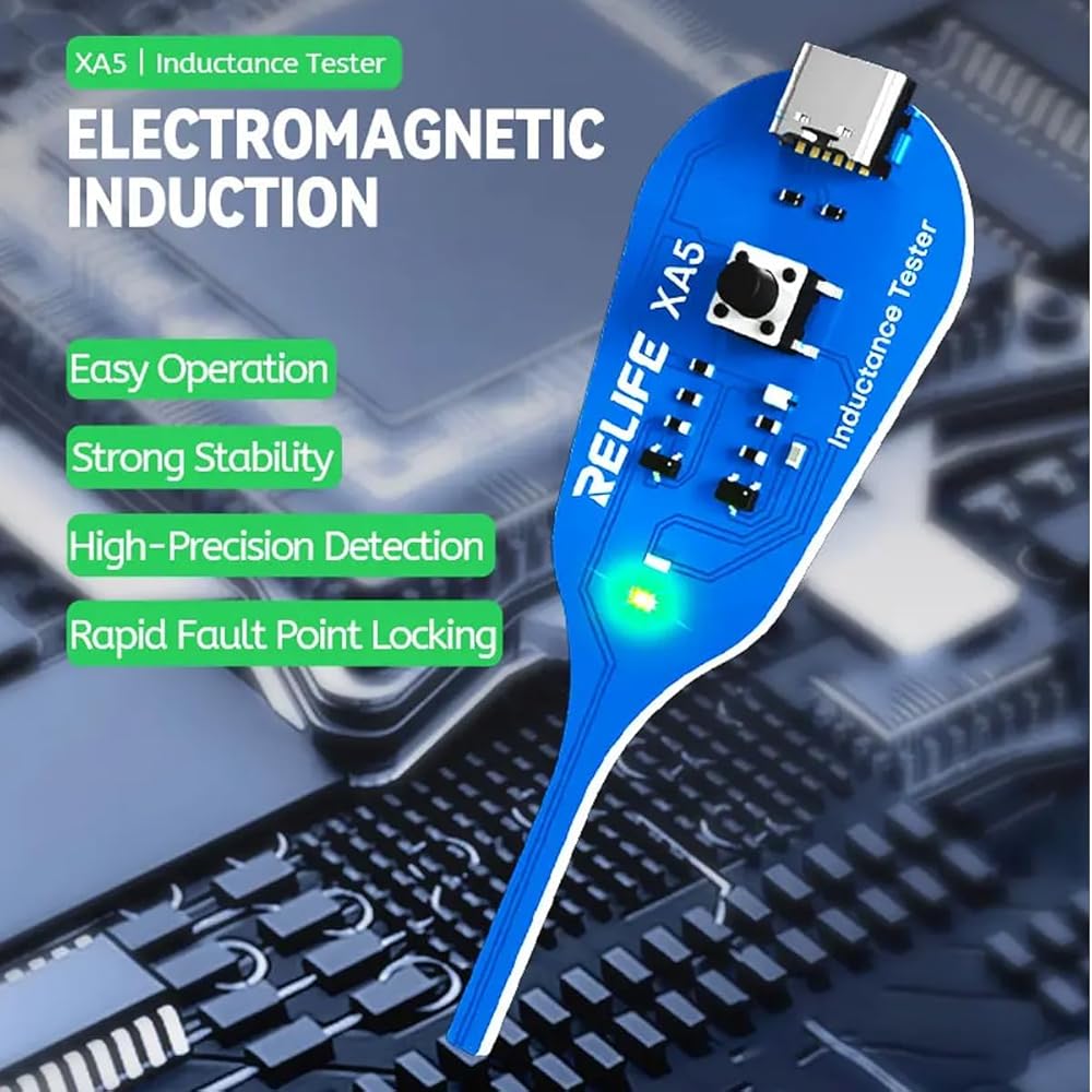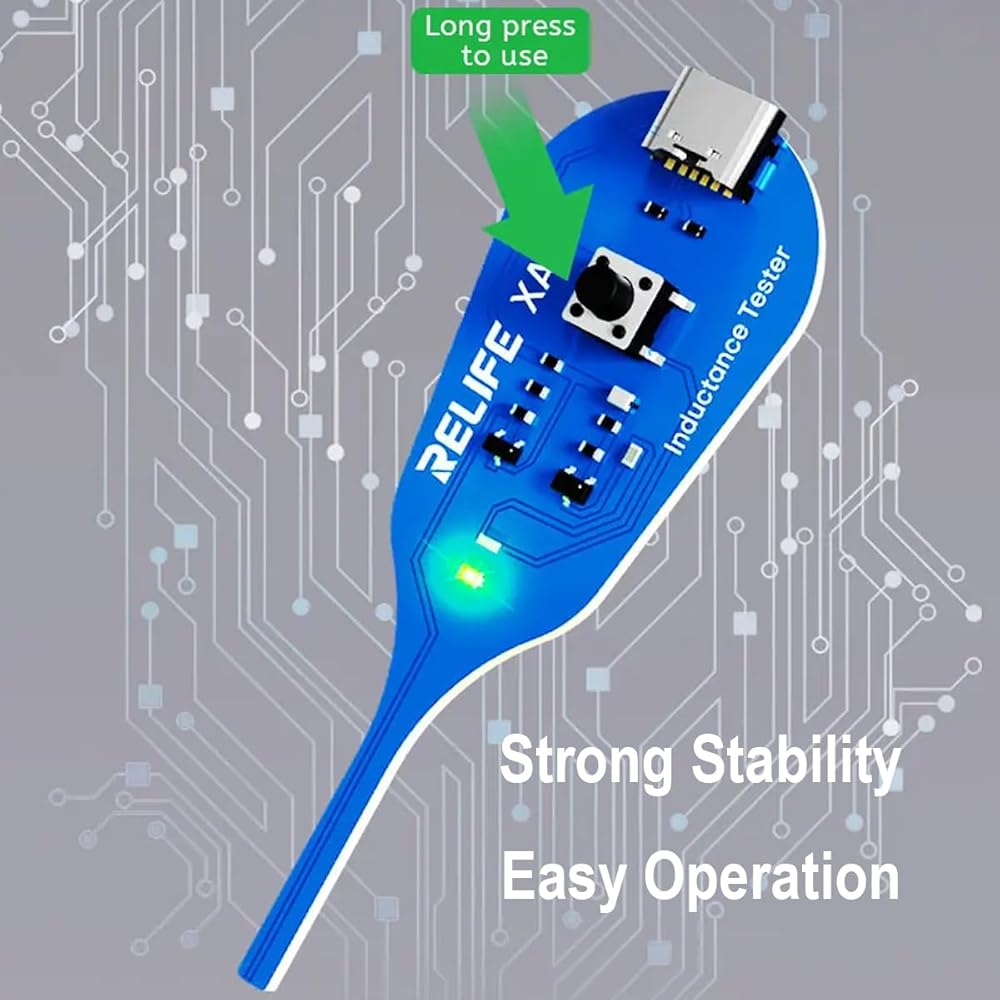 A must-have tool for electronics technicians and repair experts. Designed for quick testing of coils and inductors on motherboards and PCBs, this compact device uses the principle of electromagnetic induction to identify properly working components with a for simple green indicator light. No complicated setup required, just press and check!