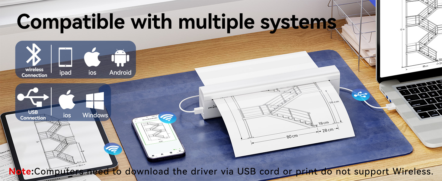 اتصال بلوتوث لاسلكي ثابت - يدعم Peripage P85 الاقتران المستقر بالبلوتوث مع iOS والهواتف الذكية التي تعمل بنظام Android والأجهزة اللوحية وأجهزة الكمبيوتر المحمولة. الطباعة بنقرة واحدة عبر تطبيق Peripage المخصص، المتوافق مع ملفات PDF وWord وExcel وTXT وJPG وملفات الويب، مما يوفر أقصى قدر من الراحة لاستخدامك اليومي.