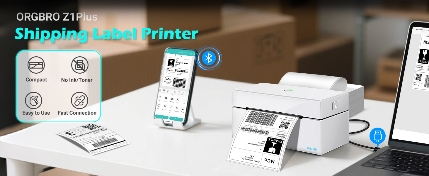انتقل لاسلكيًا باستخدام تقنية Bluetooth: تدعم طابعة ملصقات الشحن ORGBRO Z1 Plus اتصال Bluetooth السلس لطباعة الهاتف والكمبيوتر الشخصي. بالنسبة لأجهزة iOS وAndroid، ما عليك سوى تنزيل تطبيق "4Barcode" للطباعة لاسلكيًا؛ ملحوظة: يجب الاتصال من خلال تطبيق "4Barcode" ولا يمكن الاقتران مباشرة عبر إعدادات البلوتوث؛ يمكن لمستخدمي أنظمة التشغيل Windows وMac OS وChrome OS وLinux الاستمتاع بالطباعة اللاسلكية عبر دونجل Bluetooth المضمن