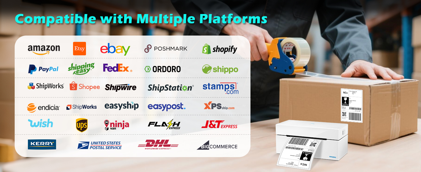 جاهز لجميع المنصات: يعمل مع Amazon وShopify وShipStation وUSPS وUPS وEndicia وDazzle والمزيد؛ تعد طابعة الملصقات الحرارية ORGBRO مثالية لاحتياجات التجارة الإلكترونية أو المستودعات أو المكاتب، مدعومة بدعم عملاء موثوق به
