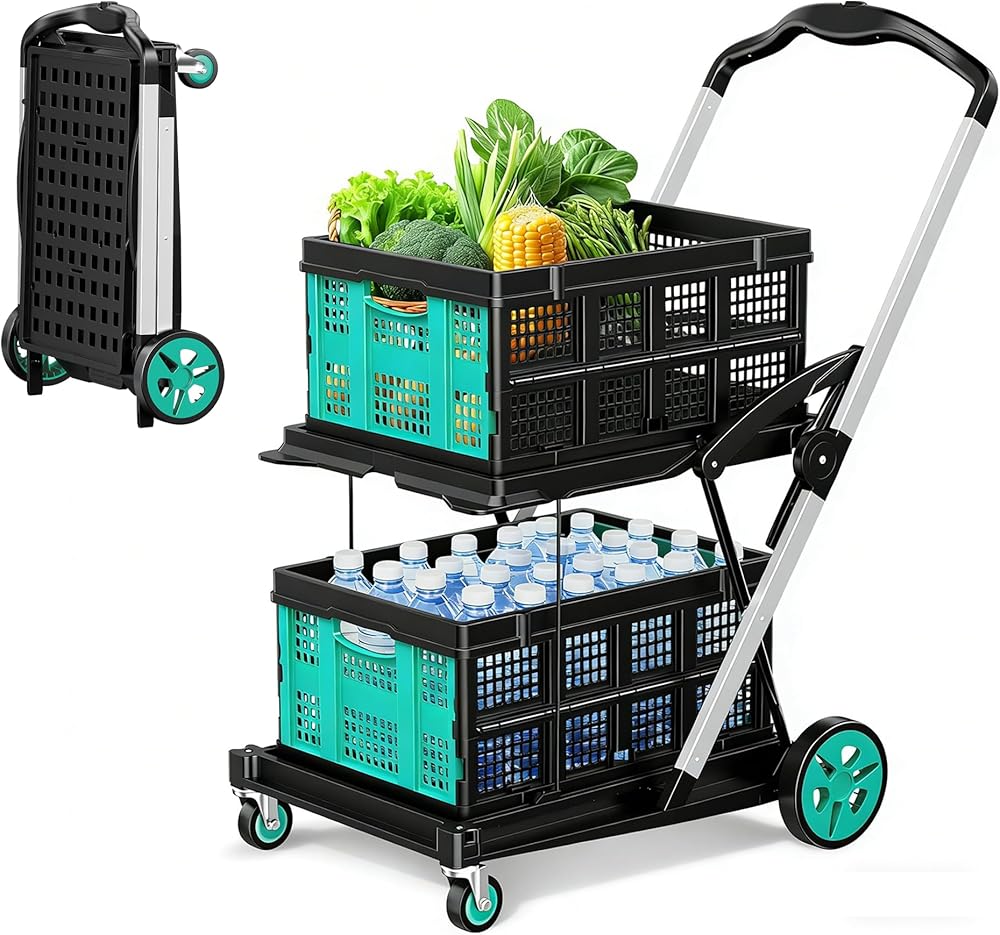 عربة تسوق قابلة للطي بعجلات من SILVEL، عربة بقالة بسعة 8 في 1 بسعة 200 رطل على عجلات مع صندوقي تخزين، عربة أدوات قابلة للطي للتسوق، والسفر، والسوبر ماركت، والمكاتب، باللون الأزرق المخضر