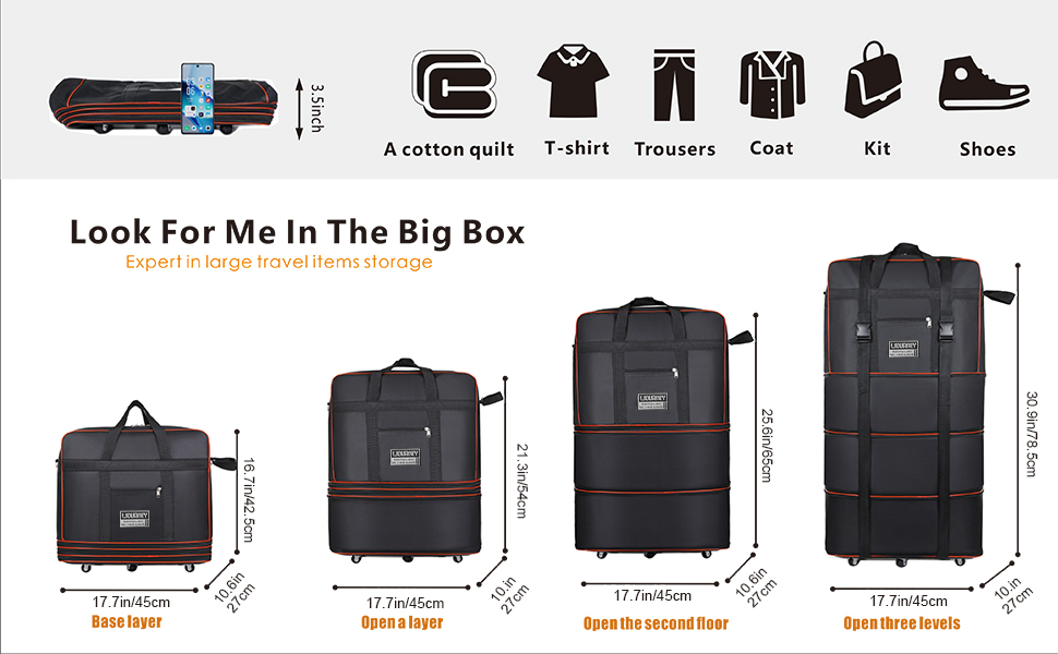 السعة: حقيبة سفر ذات سعة كبيرة قابلة للتوسيع والطي تحتوي على جيب صغير بسحاب في الأمام، يمكنك وضع جواز السفر وبطاقة الصعود والمفاتيح وغيرها من الأشياء المحمولة بسرعة. حقيبة سفر قابلة للتوسيع والطي بثلاثة سحابات لها سعة قصوى تبلغ 153 لترًا عندما تكون جميع السحابات مفتوحة، بحيث يكون سفرك سهلًا وخاليًا من المتاعب.