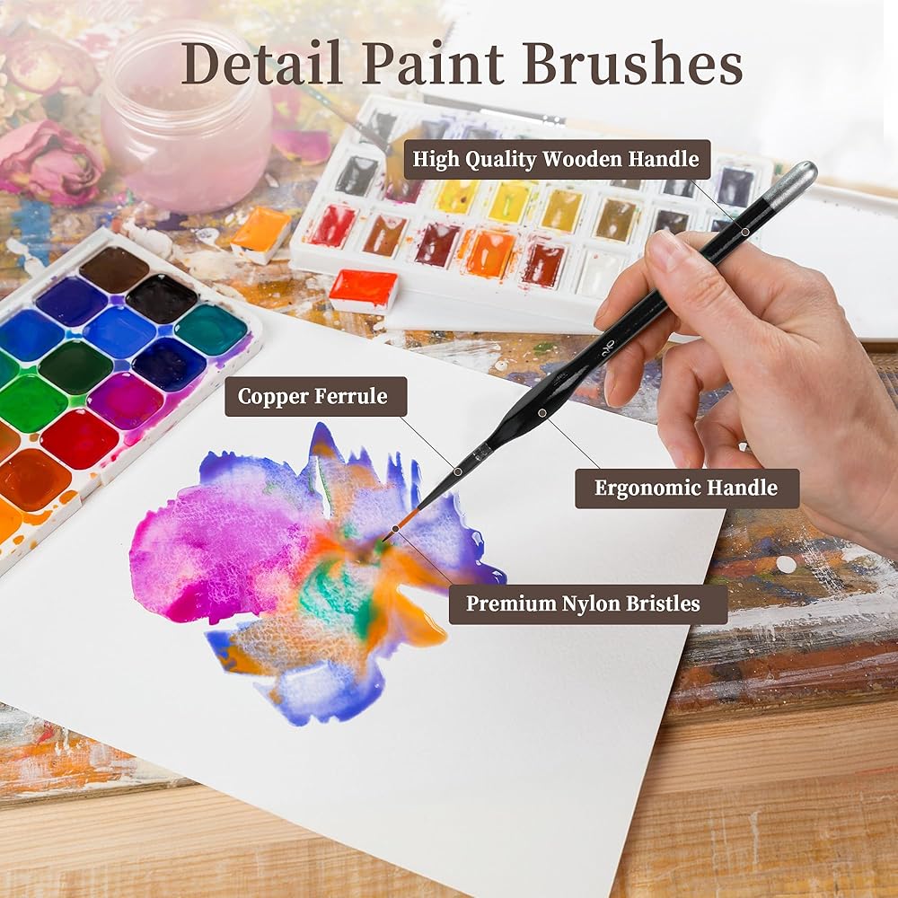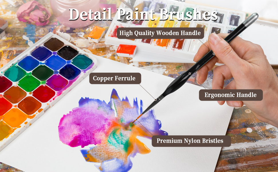 【مجموعة فرش تفصيلية عالية الجودة】: مصنوعة من شعيرات نايلون ناعمة ومرنة، فرش الطلاء هذه تمتص الطلاء بشكل ممتاز وتطلقه، مما يضمن ضربات سلسة في جميع الوسائط، بما في ذلك الأكريليك والألوان المائية والزيت والغواش. يتم تثبيت كل شعيرة بقوة على المقبض عبر حلقة من الألومنيوم، مما يضمن عدم تساقط الشعر حتى مع الاستخدام المتكرر.