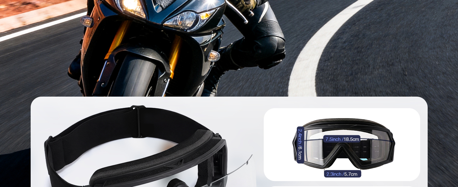 حزام رأس مرن قابل للتعديل ومتوافق مع الخوذات: حزام الرأس المرن مصنوع من القطن ويمكن تعديله ليناسب جميع أحجام الرأس. كما أنه غير قابل للانزلاق، مما يضمن ملاءمة آمنة وأقصى قدر من الراحة أثناء الركوب. تم تصميم نظارات الدراجات النارية هذه لتكون رفيقًا جيدًا لأنواع مختلفة من الخوذ، بما في ذلك خوذات الدراجات النارية ونصف الخوذ. إنها توفر حماية آمنة وملاءمة مريحة عند ركوب الدراجة النارية.