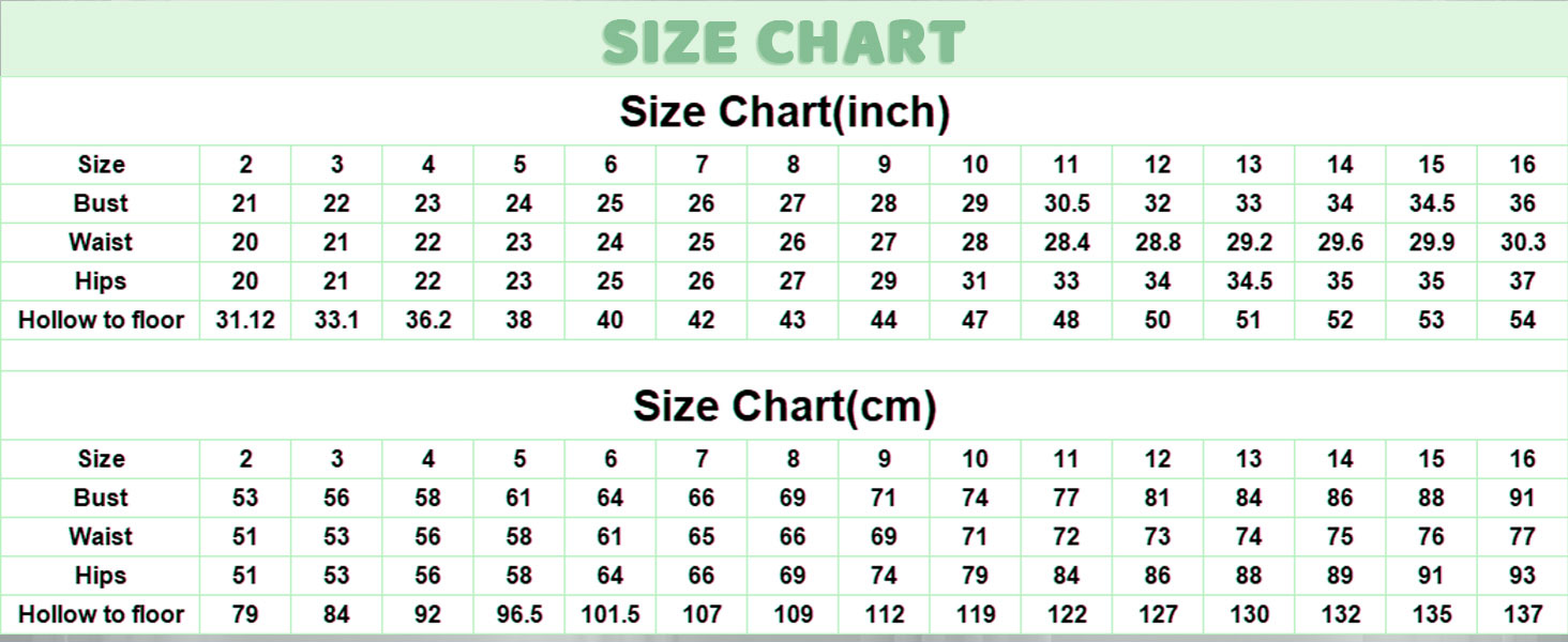 • المقاس: فساتين وصيفات العروس الصغيرة لدينا متوفرة بمقاسات من 2 إلى 16. يرجى التحقق من جدول المقاسات الخاص بنا قبل تقديم الطلب. إذا كنت بحاجة إلى مقاس مخصص، فيرجى اختيار المقاس الأقرب أولاً وتزويدنا بقياسات الصدر والخصر والورك ومن أسفل إلى الأرض (بدون حذاء)