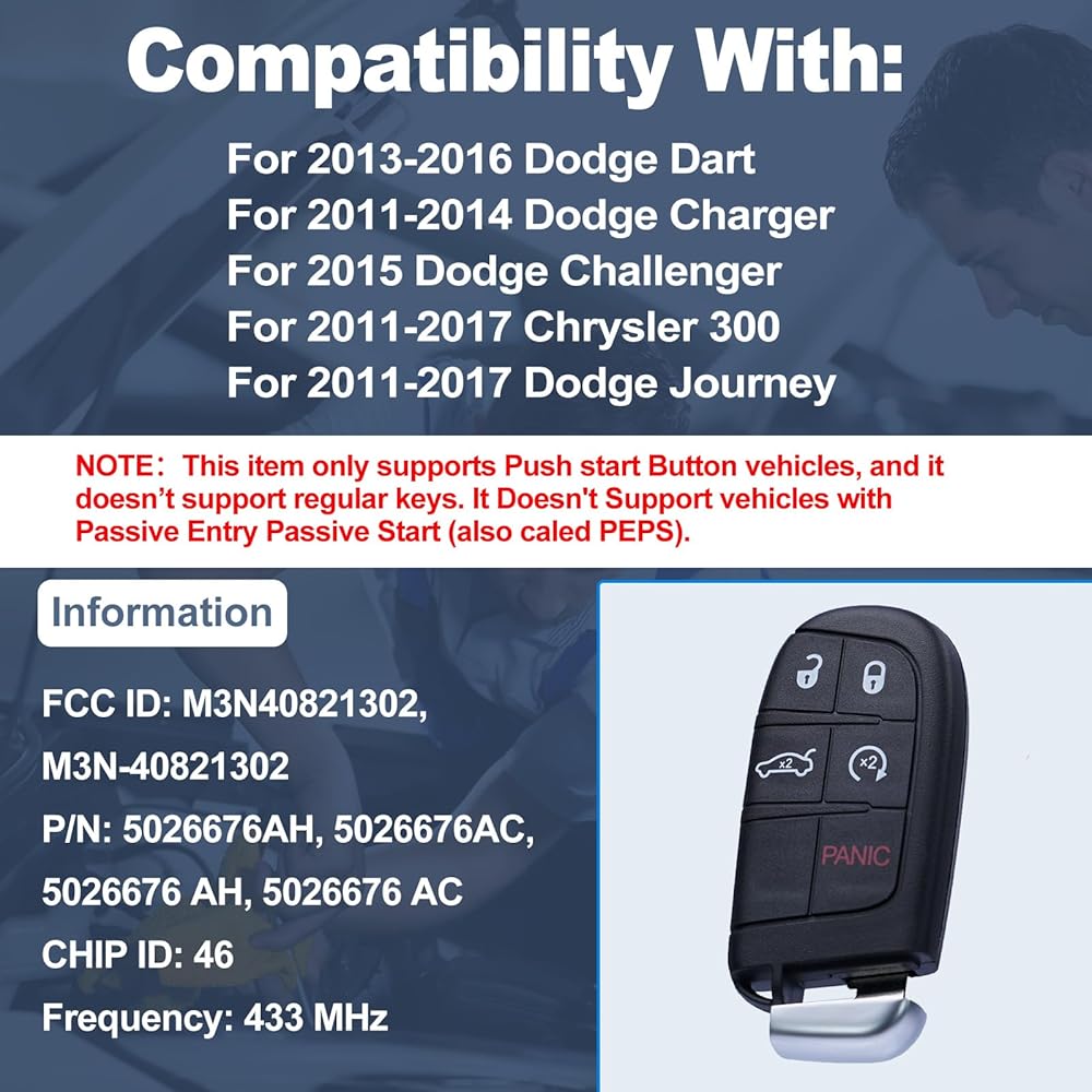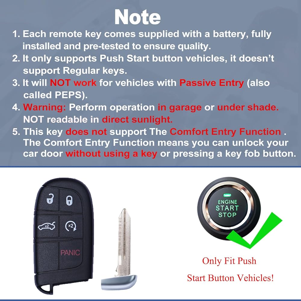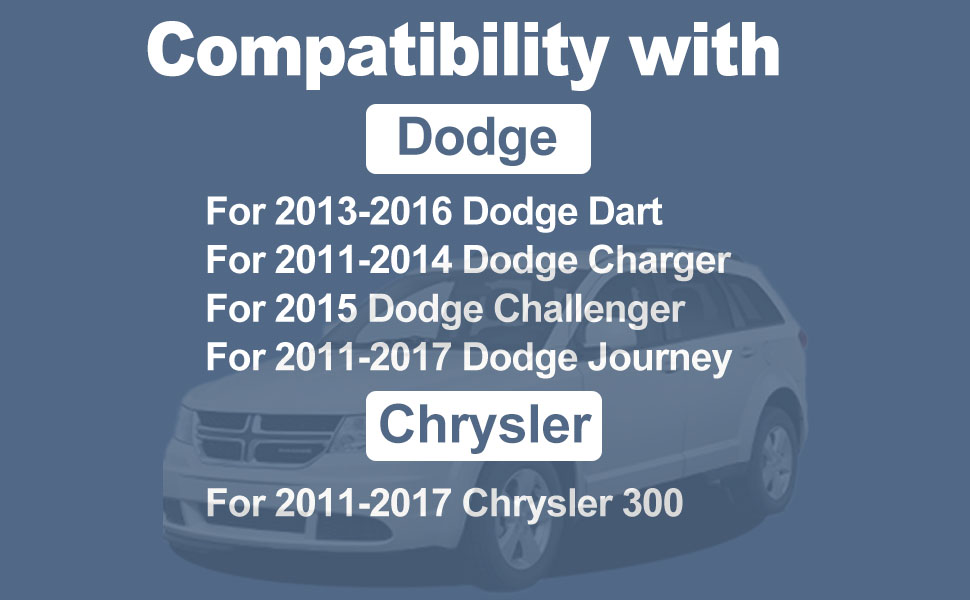 الإعداد: متوافق مع دودج دارت 2013-2016، دودج تشارجر 2011-2014، دودج تشالنجر 2015، كرايسلر 300 2011-2017، دودج جورني 2011-2017 مفتاح التحكم عن بعد. (ملاحظة: عند استخدامه، إذا لم تعمل السيارة أو أخطأت أو تحتاج إلى رمز التعريف الشخصي، فيرجى الاختيار حسب النظام وتجربته واحدًا تلو الآخر) يدعم جهاز الإرسال هذا فقط مركبات زر التشغيل، ولا يدعم المركبات الرئيسية العادية.