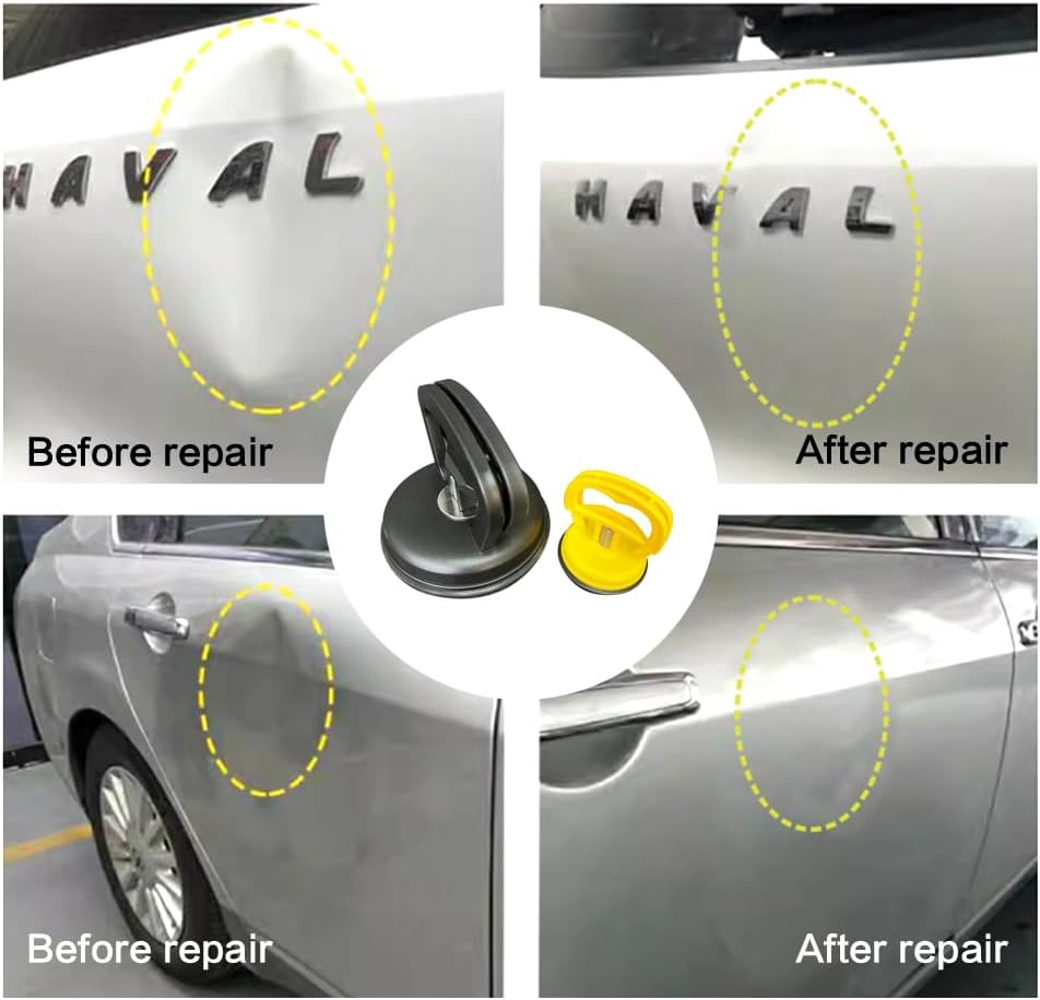 【سهلة الاستخدام】- قبل استخدام أداة إصلاح الانبعاجات، تأكد بعناية من أن المنطقة المنبعجة أكبر من قطر قاعدة كوب الشفط. قبل إصلاح الانبعاج، قم بتنظيف سطح السيارة وأداة إصلاح الانبعاج لتعزيز الشفط. افصل مقبض كوب الشفط عن أداة إصلاح الانبعاج واضغط بقوة على المنطقة المنبعجة، مما يضمن عدم وجود تسرب للهواء حولها. اعتمادا على شدة الانبعاج، كرر الخطوات المذكورة أعلاه عدة مرات حتى يتم إصلاحه بالكامل