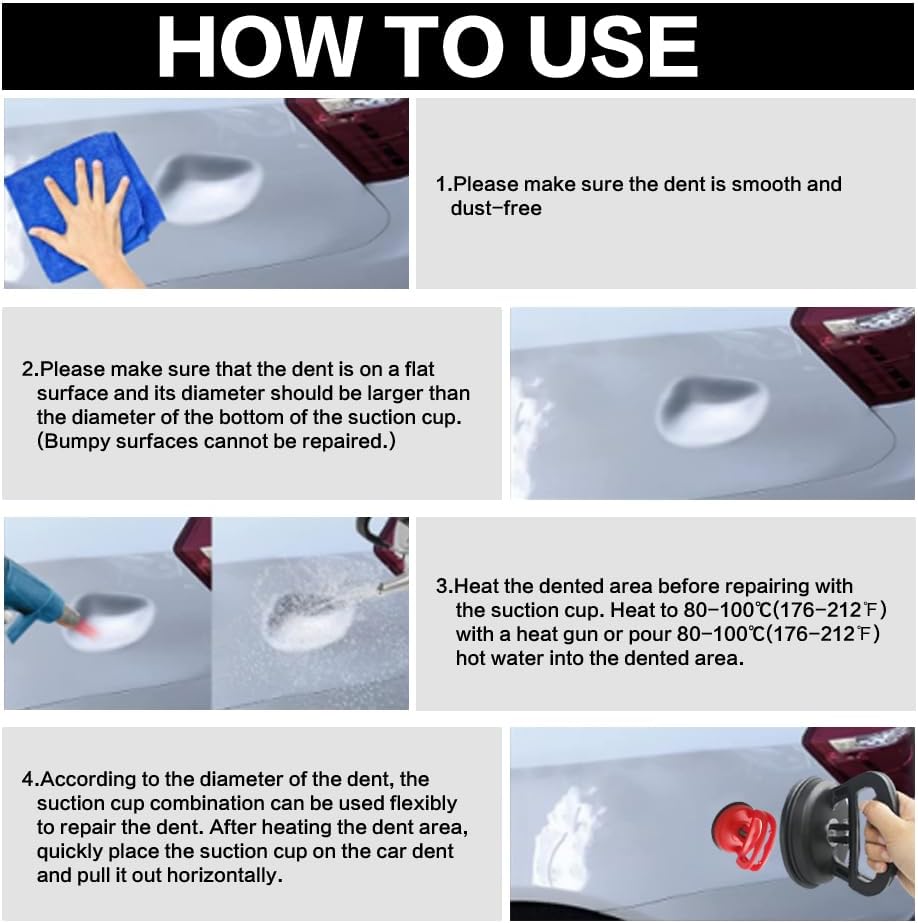【احتياطات】- مجموعة أدوات إصلاح الانبعاجات هذه مناسبة فقط للخدوش الموجودة على الأسطح المرنة لجسم السيارة الناتجة عن الصدمات. تأكد من أن المنطقة المنبعجة أكبر من قطر كوب الشفط واستخدمها على سطح نظيف وناعم ومسطح وغير مسامي وجاف.