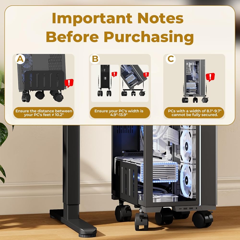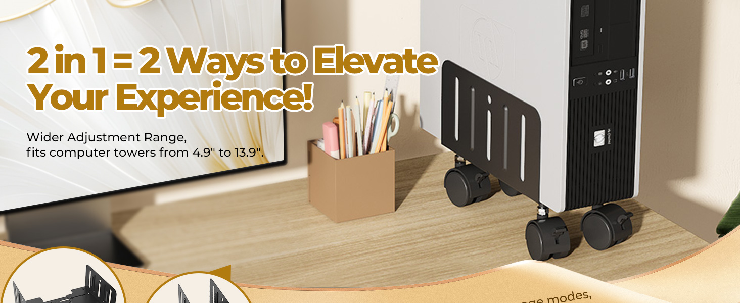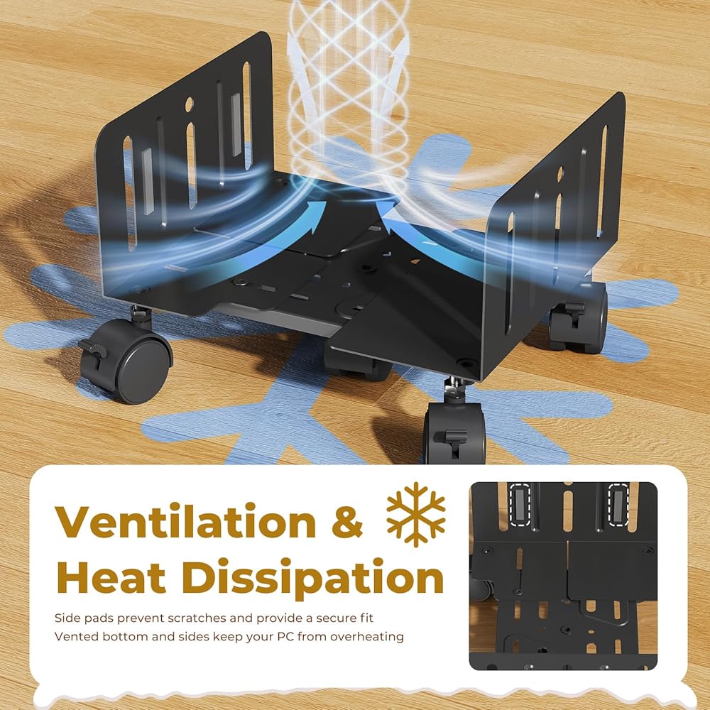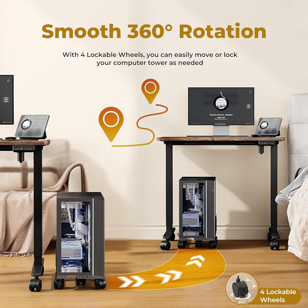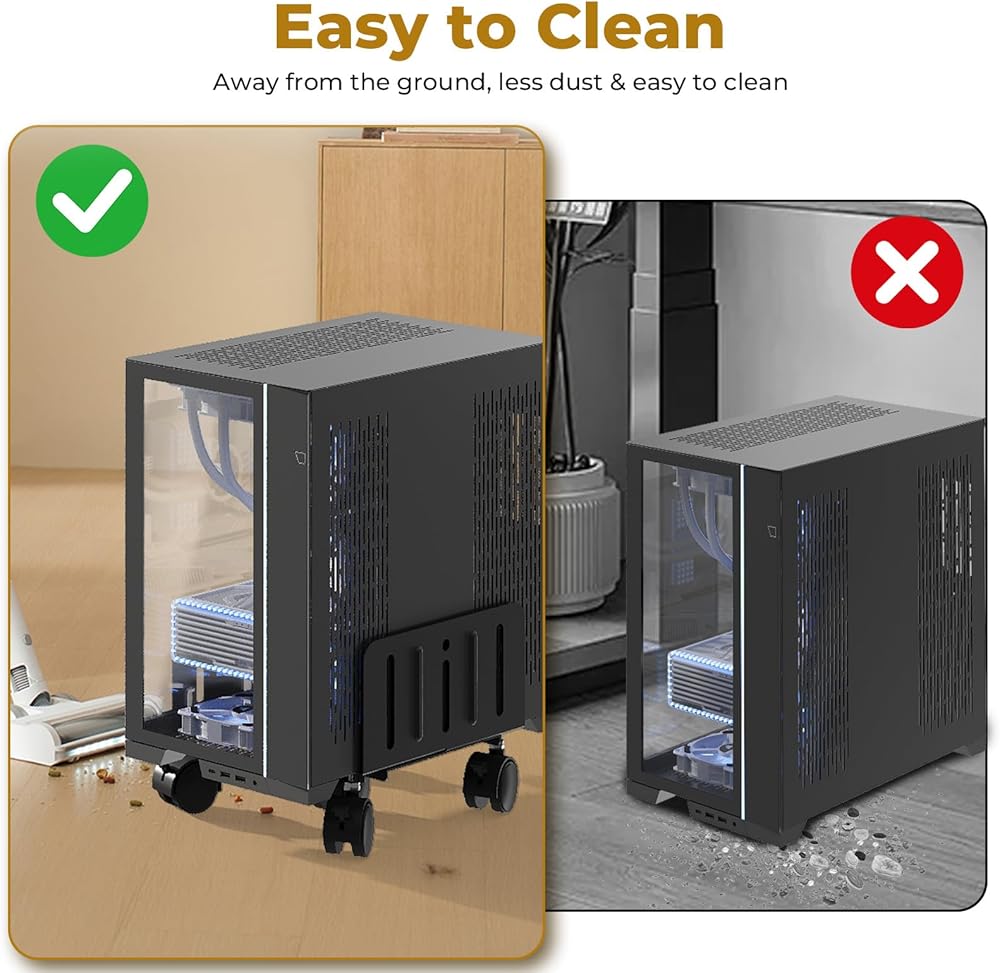 التهوية ومنع الغبار: يعد تحسين دوران الهواء ومساحة العمل النظيفة من المزايا الرئيسية لعربة الكمبيوتر المكتبية هذه. من خلال رفع البرج الخاص بك، فإنه يساعد على تبديد الحرارة ويمنع تراكم الغبار تحته