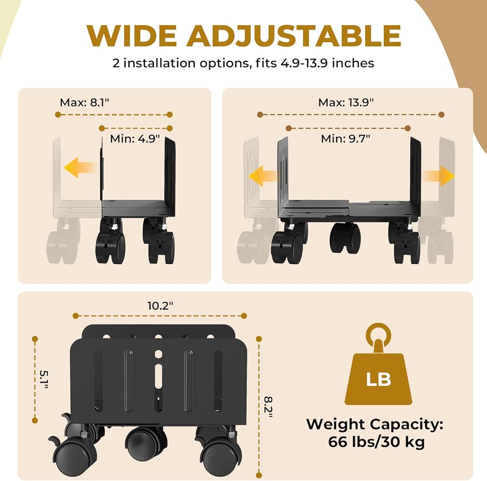 توافق أوسع: نطاق تعديل العرض لحامل وحدة المعالجة المركزية المحمول هذا هو 4.9 بوصة - 13.9 بوصة، والذي يمكنه استيعاب معظم الأبراج الموجودة في السوق. ملحوظة: يرجى قياس أبعاد حافظة الكمبيوتر الخاص بك قبل الشراء