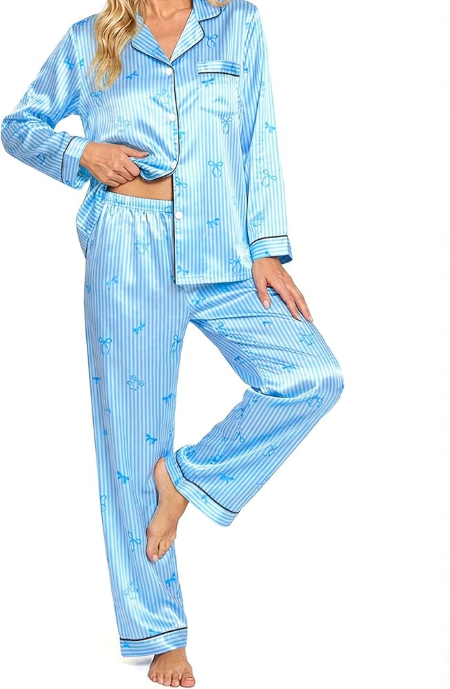 【Premium Fabric】Womens pattern satin pajamas set is crafted from exclusive satin fabric, soft to the touch, skin-friendly, lightweight and breathable. It's comfy to wear next to the skin without stuffiness, helping you enjoy a peaceful and restful sleep.