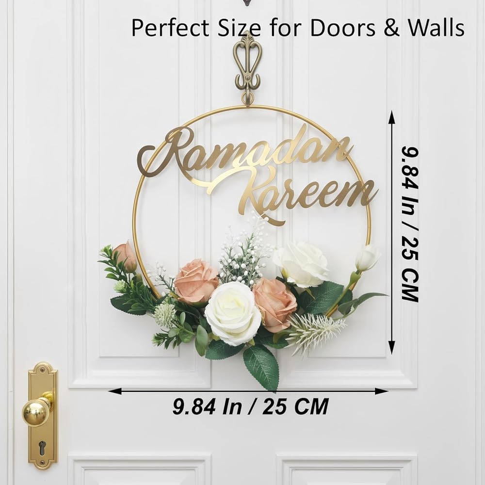 Elegant Ramadan Wreath: Features a modern round metal hoop with beautifully arranged artificial flowers, adding a refined and festive touch to your Ramadan decor.