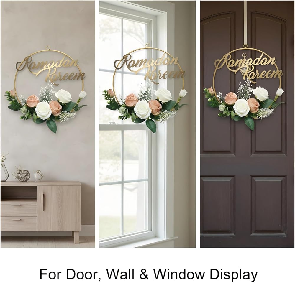 Celebrate the beauty and spirit of Ramadan with this elegant Ramadan Kareem floral wreath, thoughtfully designed to bring warmth and serenity to your home. The golden metal hoop creates a clean, modern frame, while the carefully arranged artificial flowers add softness and natural charm, making it a standout decorative piece for the holy month. Designed for versatility, this Ramadan wreath complements both minimalist and classic interiors and can be reused year after year.
