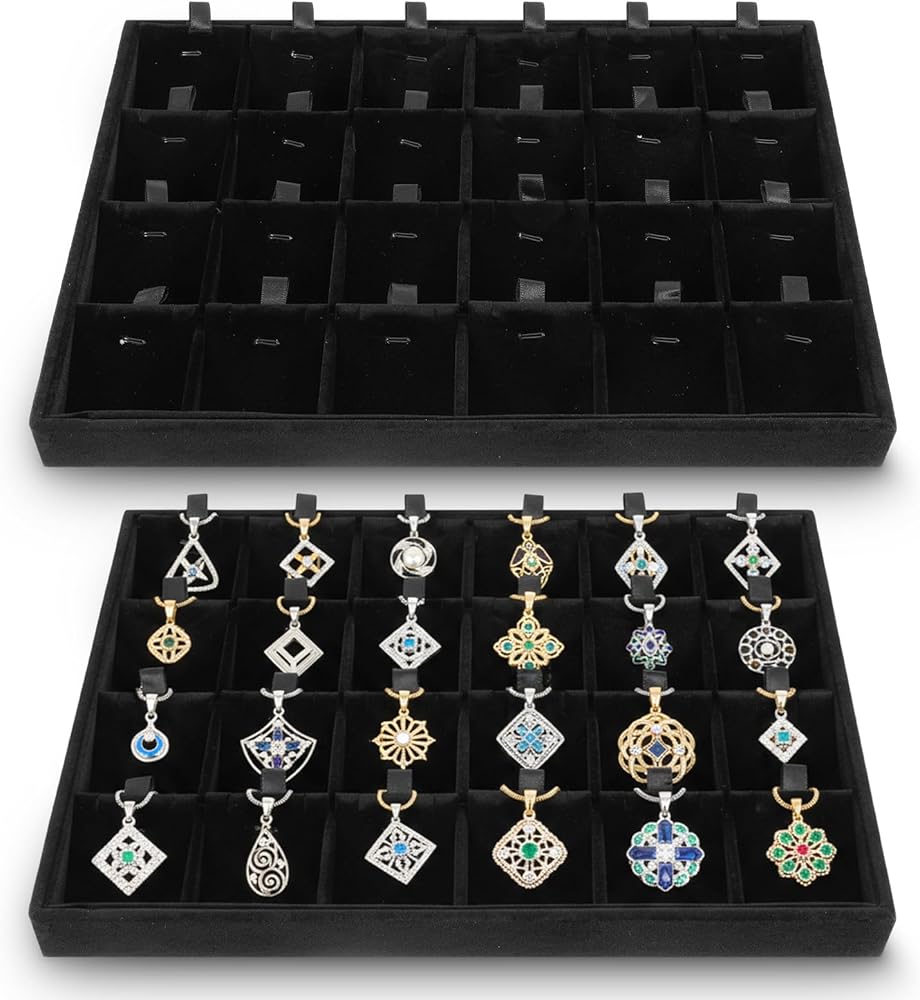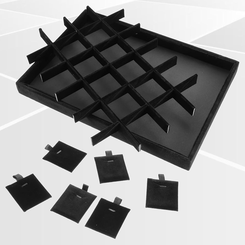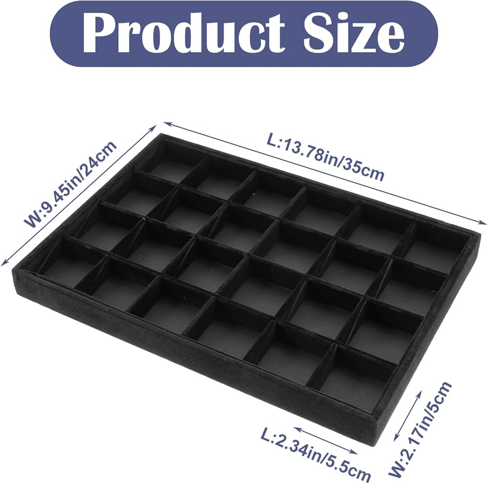 【Complete Package & Satisfaction】Each set includes two black velvet jewelry trays, each with 24 removable grids. The overall dimensions are 14x10x2.8 inches, with each grid measuring 2x2.2 inches. We stand behind the quality of our jewelry organizer and offer a satisfaction guarantee—if you are not fully happy with your purchase, we provide prompt support including refund or replacement. This commitment ensures a risk-free experience and confidence in your organization solution.
