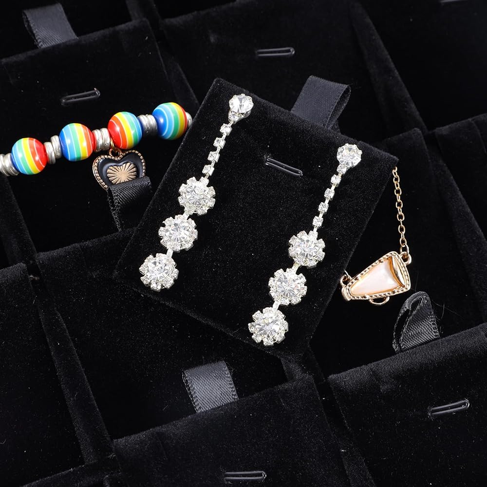 عبوتان من منظم صينية المجوهرات المخملية القابلة للتكديس مع فواصل قابلة للإزالة، 24 شبكة من صواني تخزين المجوهرات للأقراط والقلائد والأساور والخواتم، باللون الأسود