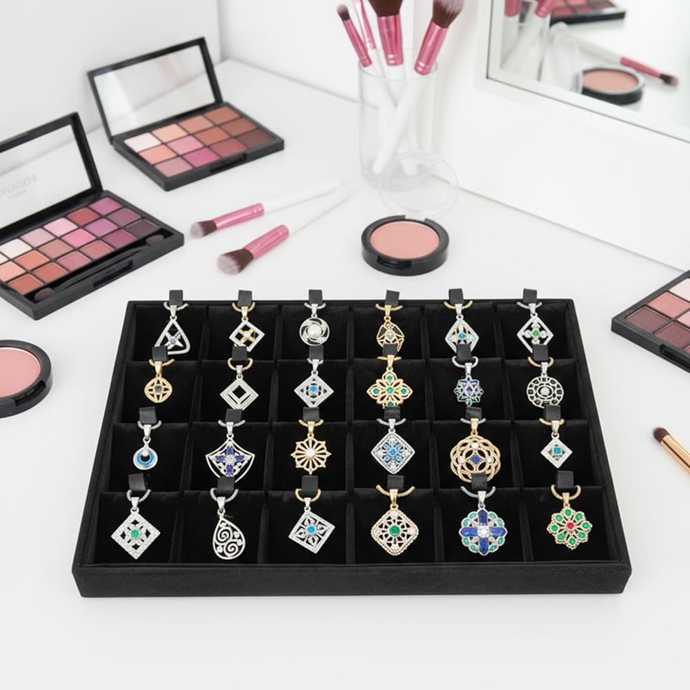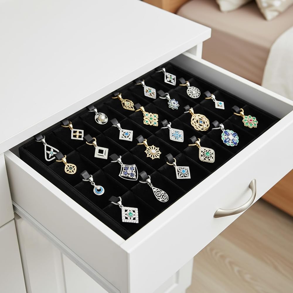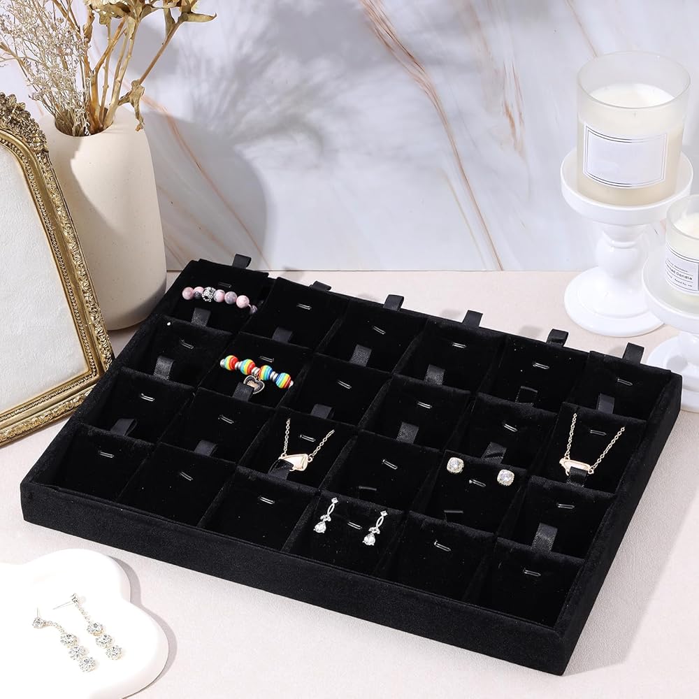 【Premium Material】Crafted from high-quality composite board and wrapped in smooth ice velvet fabric, this velvet jewelry tray offers a soft and scratch-resistant surface, ideal for protecting delicate jewelry items such as earrings, necklaces, and rings. The durable construction ensures long-term use without wear or fading, while the elegant black finish adds a touch of sophistication to any dresser, countertop, or drawer. Each jewelry storage tray is designed to keep your accessories organized and visible, making it easier to select and store your favorite pieces daily.