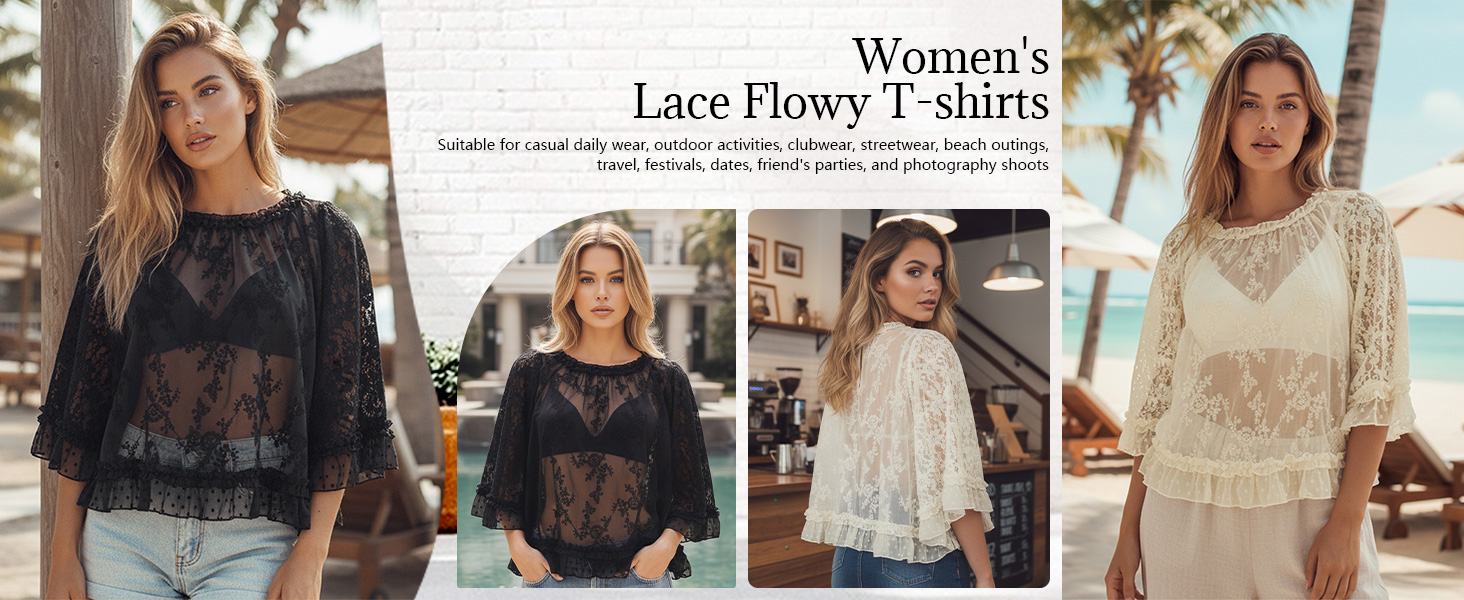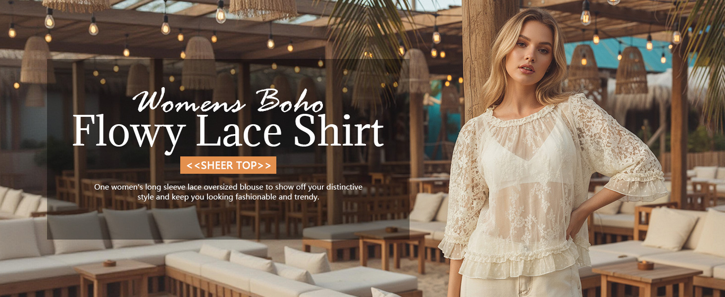 قميص نسائي بوهو من الدانتيل المتدفق بأكمام واسعة وكشكشة شفافة غير رسمية فضفاضة شفافة لتغطية بلوزة الصيف ملابس الشاطئ