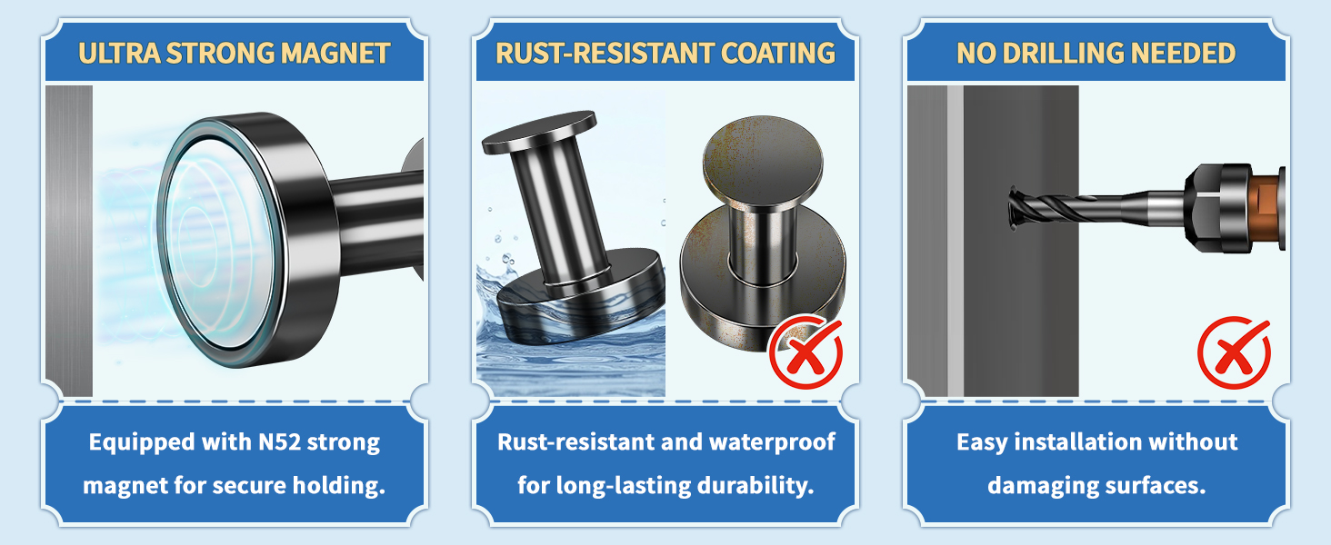 • طلاء ممتاز: تمت معالجة هذه الخطافات المغناطيسية بثلاث طبقات من طلاء Ni-Cu-Ni، مما يوفر لمسة نهائية لامعة وناعمة مع ضمان مقاومة ممتازة للتآكل والخدوش. حتى مع التعرض لفترات طويلة للبيئات الرطبة مثل المطابخ أو الشوايات أو جدران السفن السياحية، فإنها تحافظ على مظهرها الجديد تمامًا، ولا تحتاج إلى صيانة، كما أنها مقاومة للصدأ. وهذا يجعلها مناسبة بشكل خاص للاستخدام في الرحلات البحرية أو أماكن التخييم، حيث يمكنها تحمل تحديات الظروف القاسية.