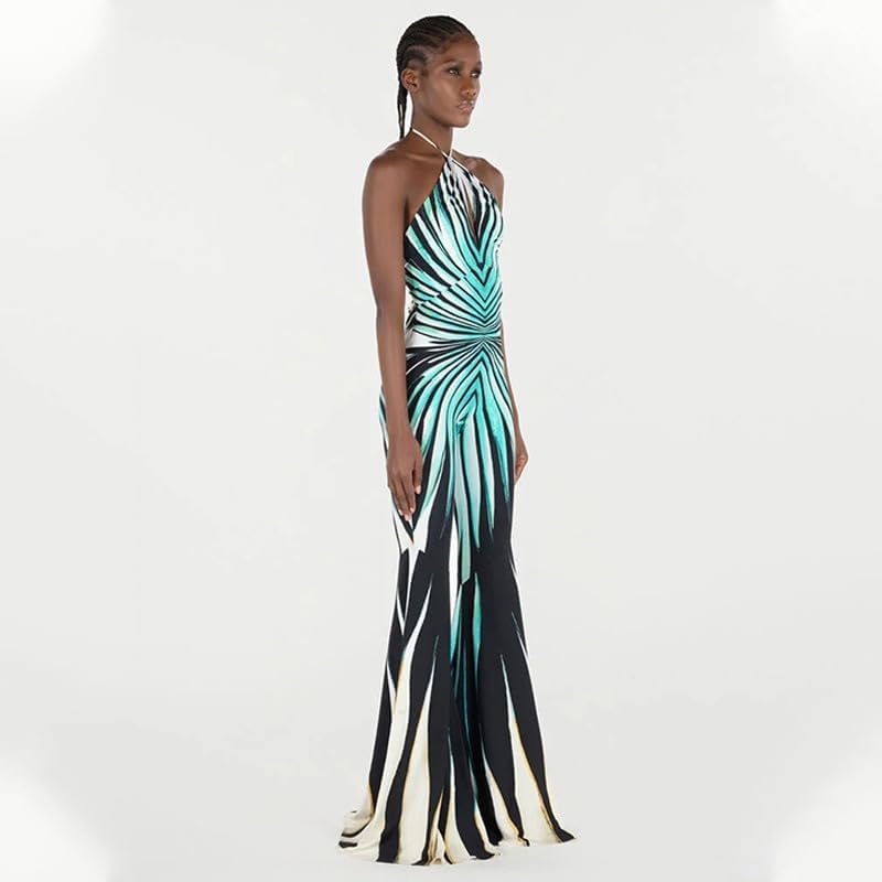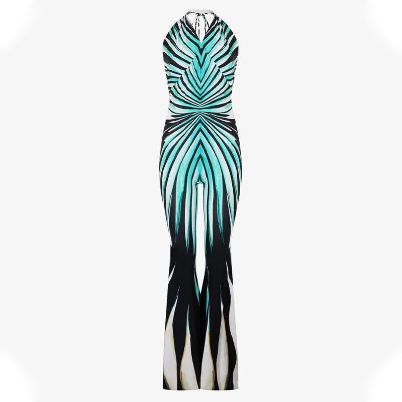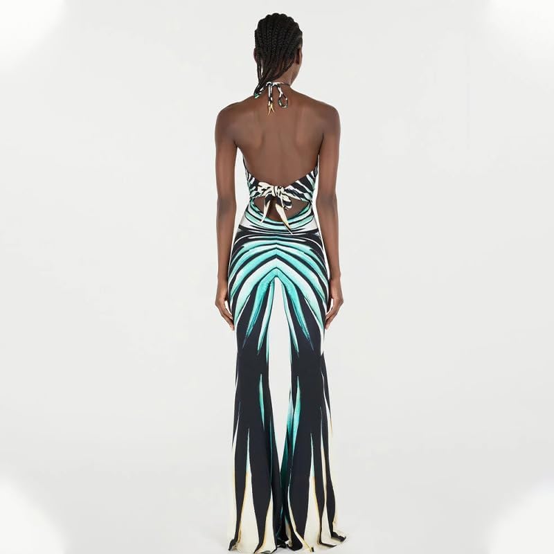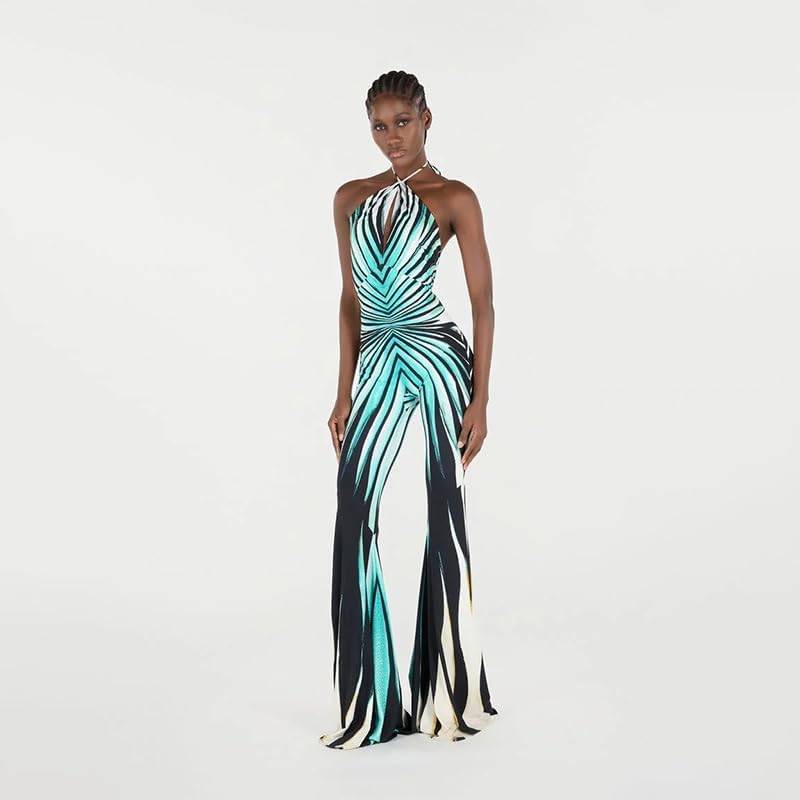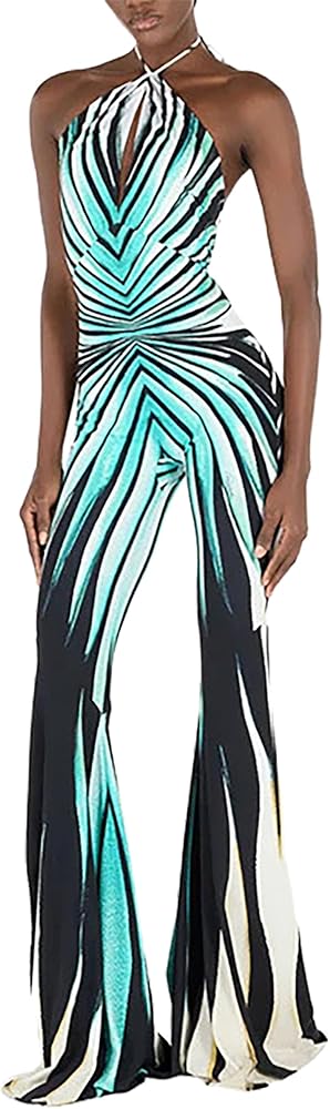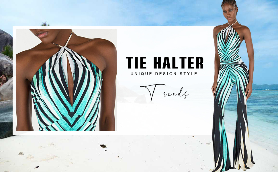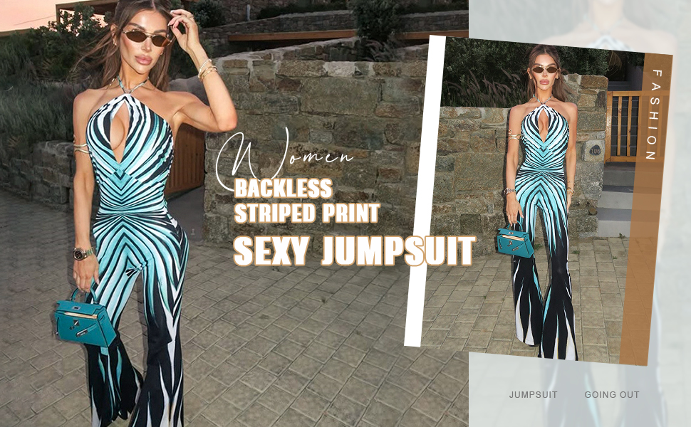 السمات: بدلة قطعة واحدة للنساء، بذلة مثيرة، طباعة مخططة، رسن ربطة عنق، بدون أكمام، بدون ظهر، بوديكون، سروال متوهج، سروال رومبير، مقاس نحيف.