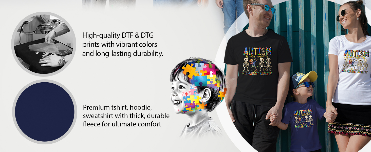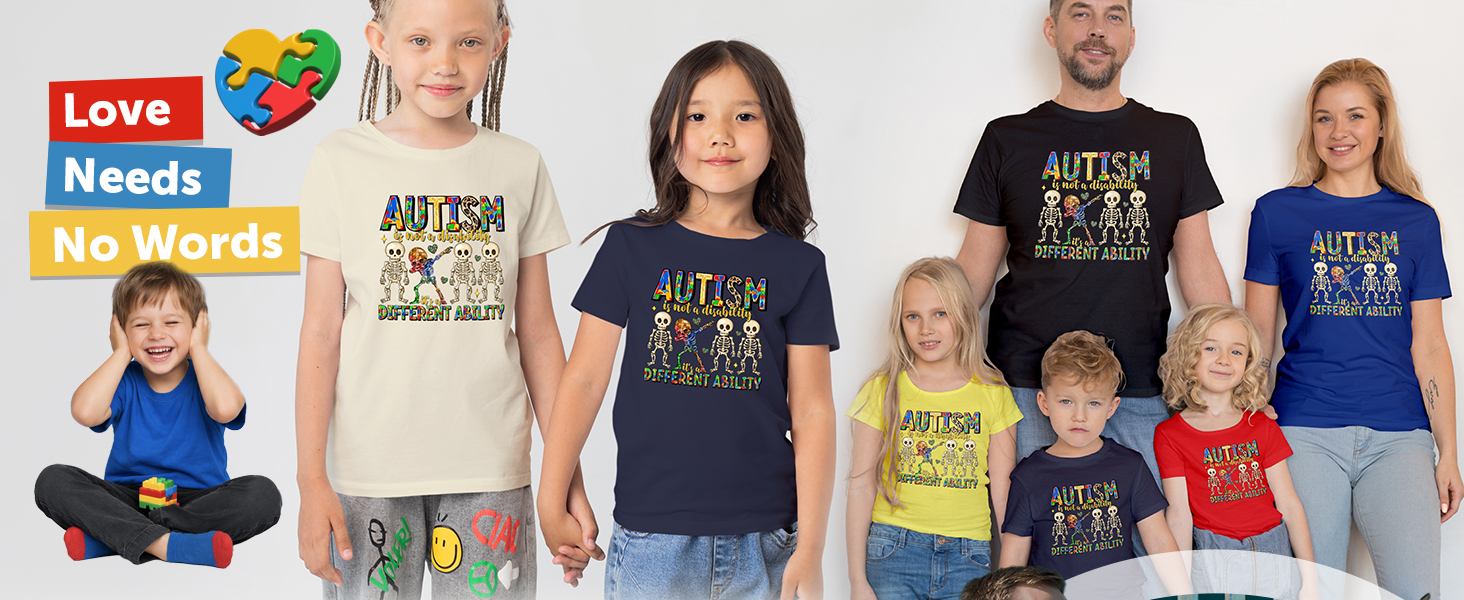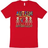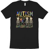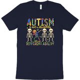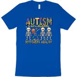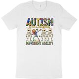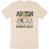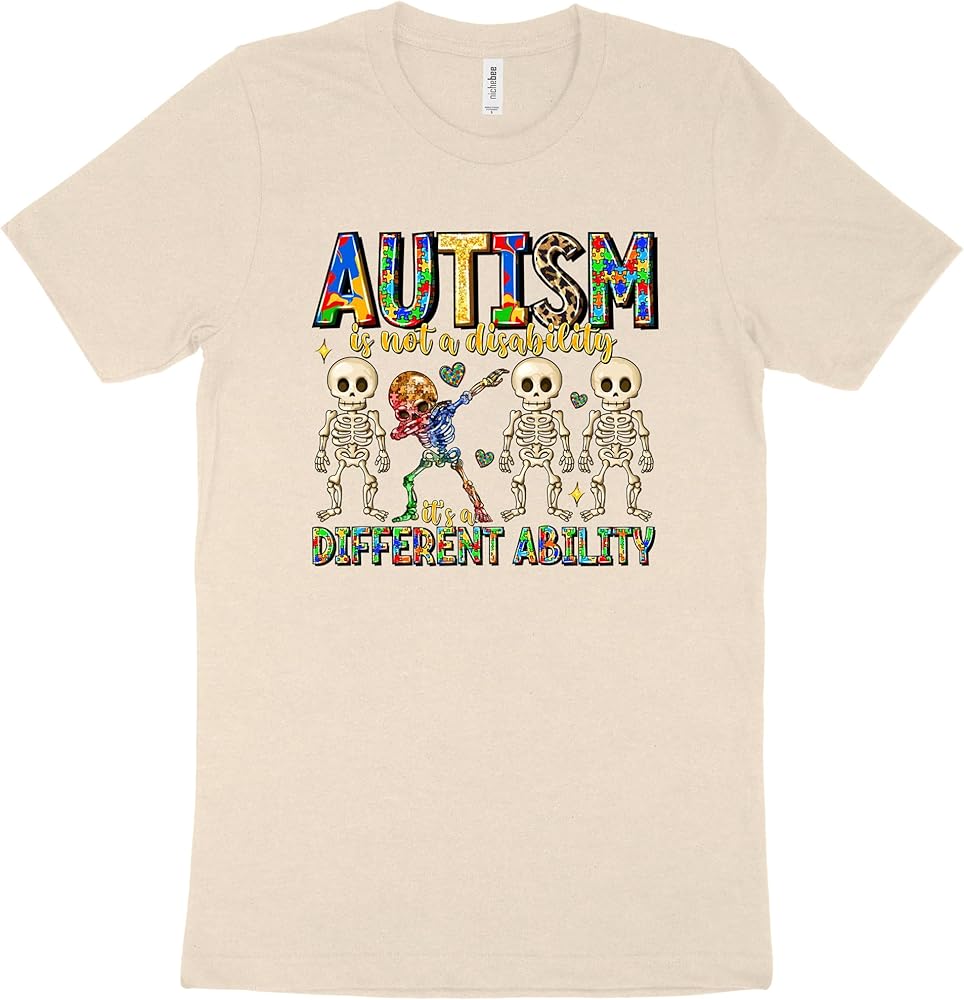 قميص للتوعية بالتوحد يلفت الأنظار: عزز رسالة إيجابية مع هذا القميص النابض بالحياة للتوعية بالتوحد. يتميز بشعار التمكين "التوحد ليس إعاقة، إنها قدرة مختلفة" وهيكل عظمي مربّع، هذا القميص المخصص للتوحد مثالي لنشر الوعي بالتوحد بابتسامة.